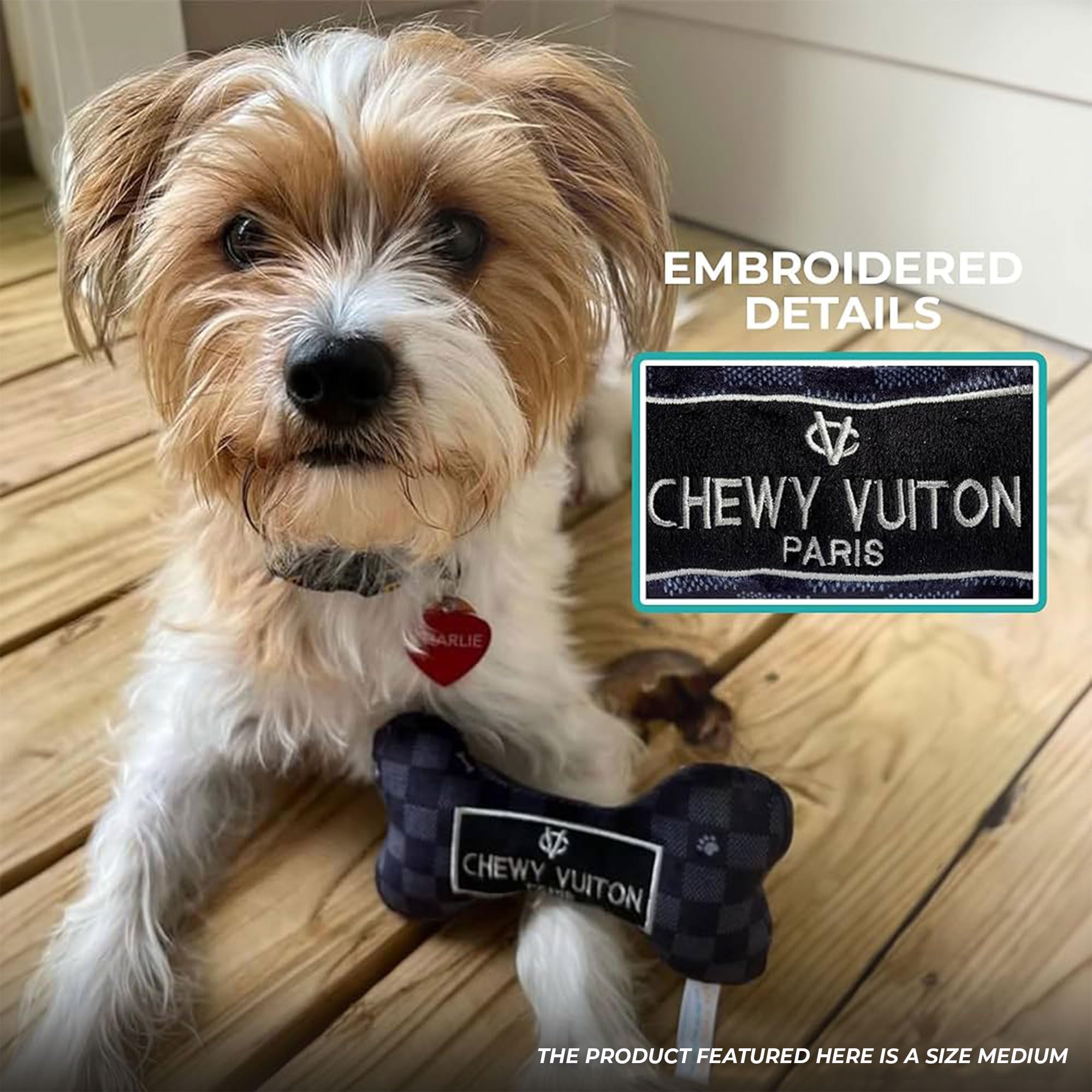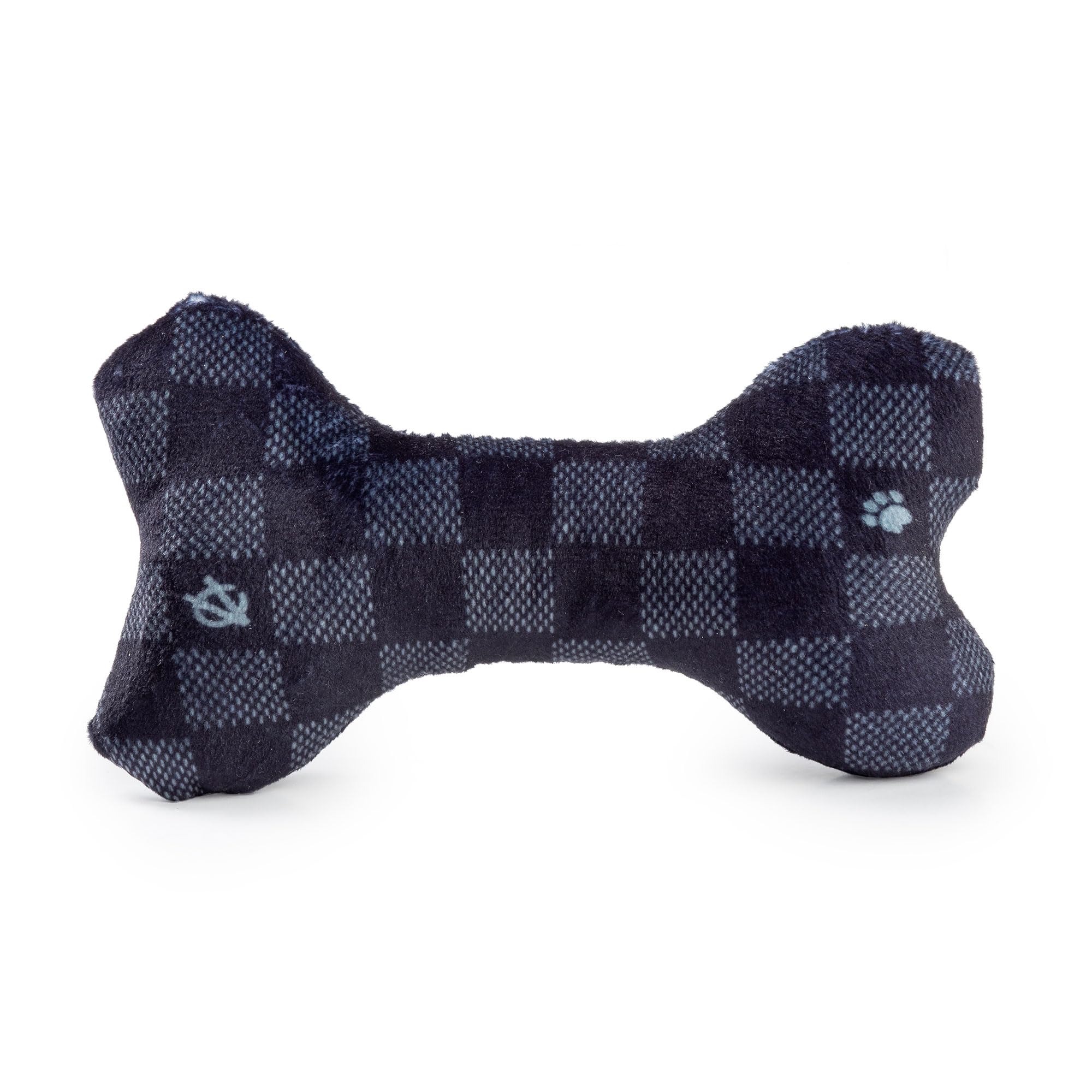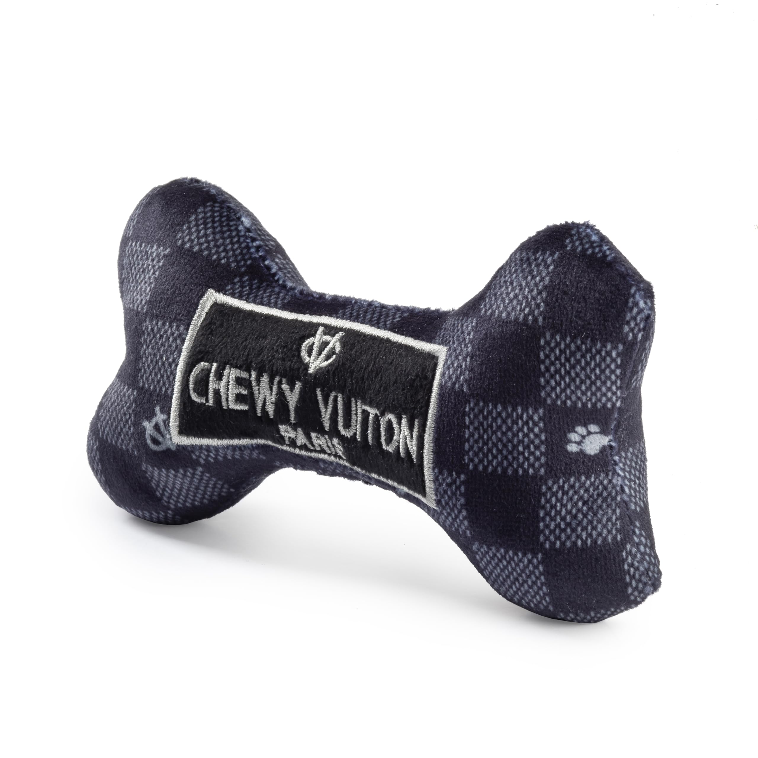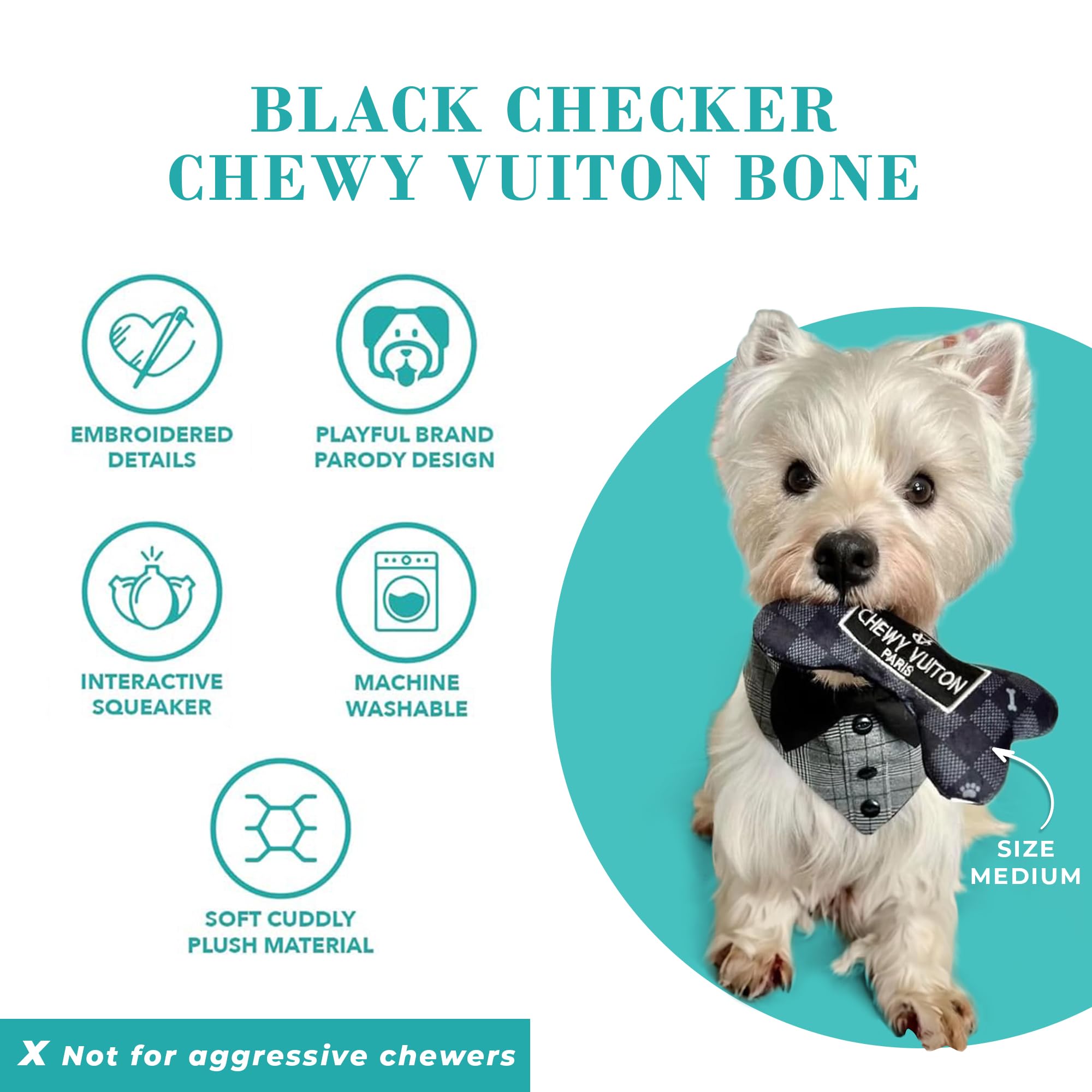 Funny Parody Plush Dog Toy: Let your furry fashionista fetch some fashion-forward fun with this Black Checker Chewy Vuiton Bone that features a stylish black checker pattern. It’s a playful, cute interactive dog toy that combines style & fun. Size Small 4.5"x3"x1".