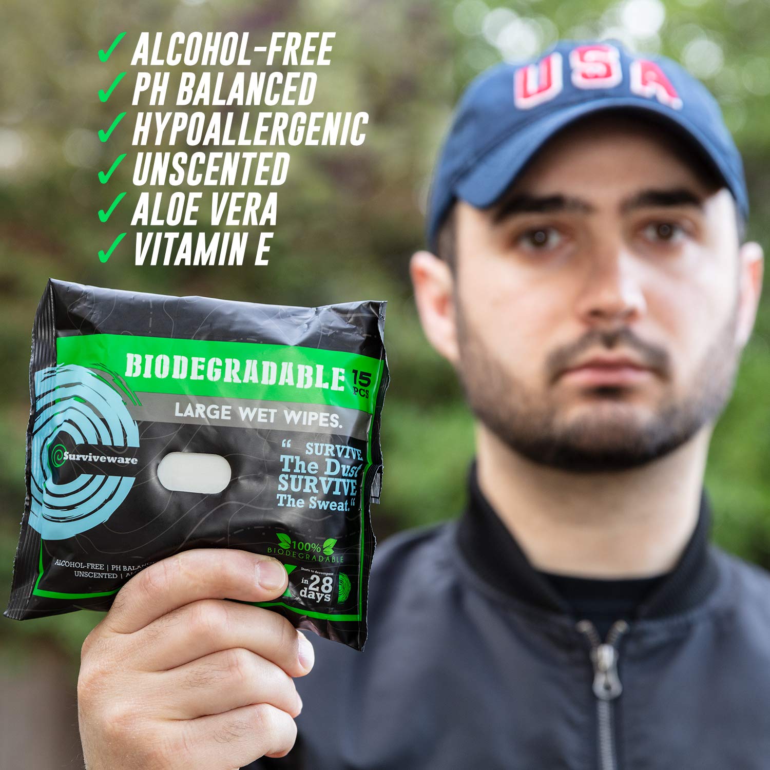 UNSCENTED WET WIPES: Clean yourself with our unscented biodegradable wipes from head to toe without being overwhelmed by a smell or attracting unwanted bugs on the trail. Our wipes are alcohol free, pH balanced, and made with aloe. Suitable for sensitive skin.