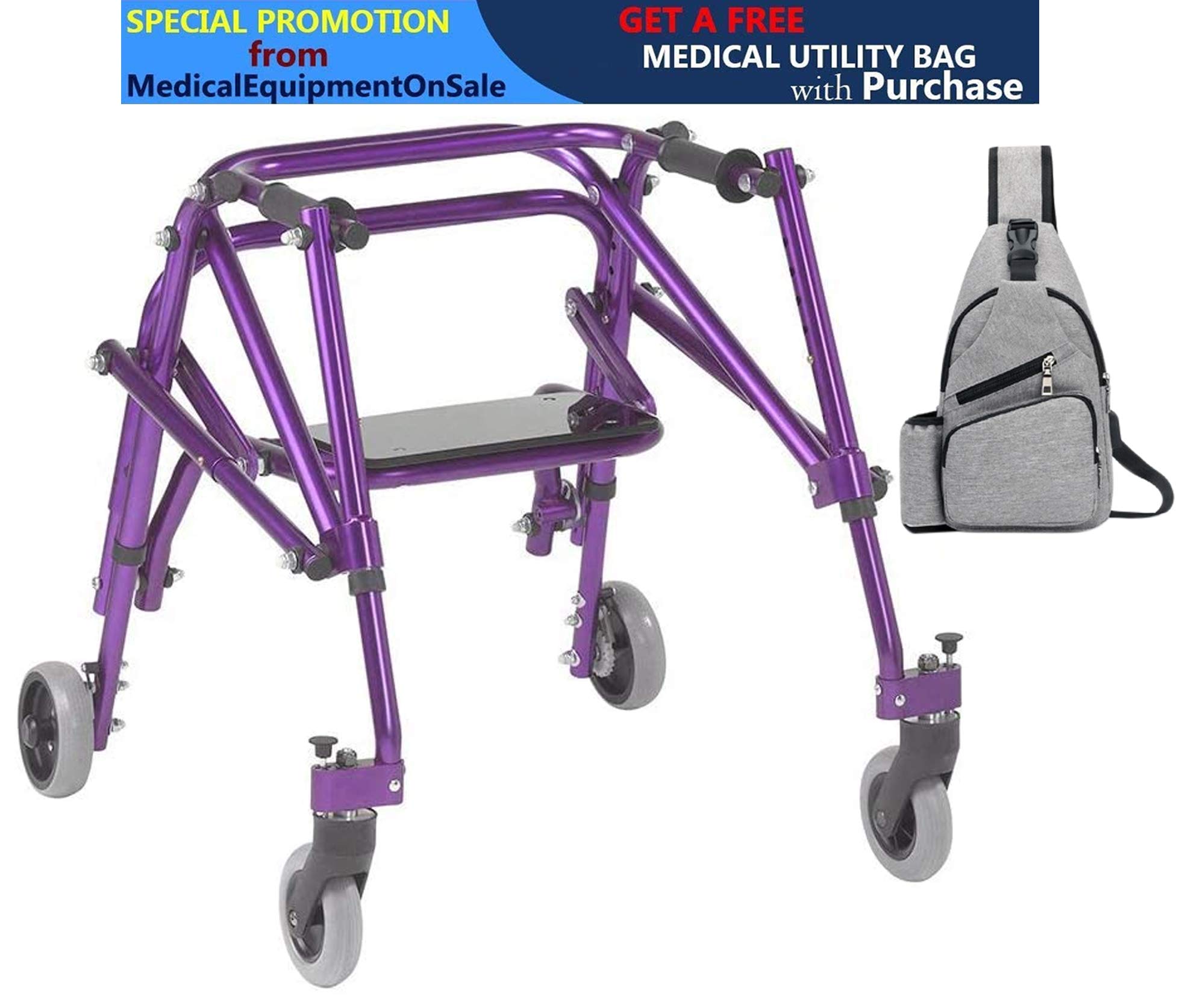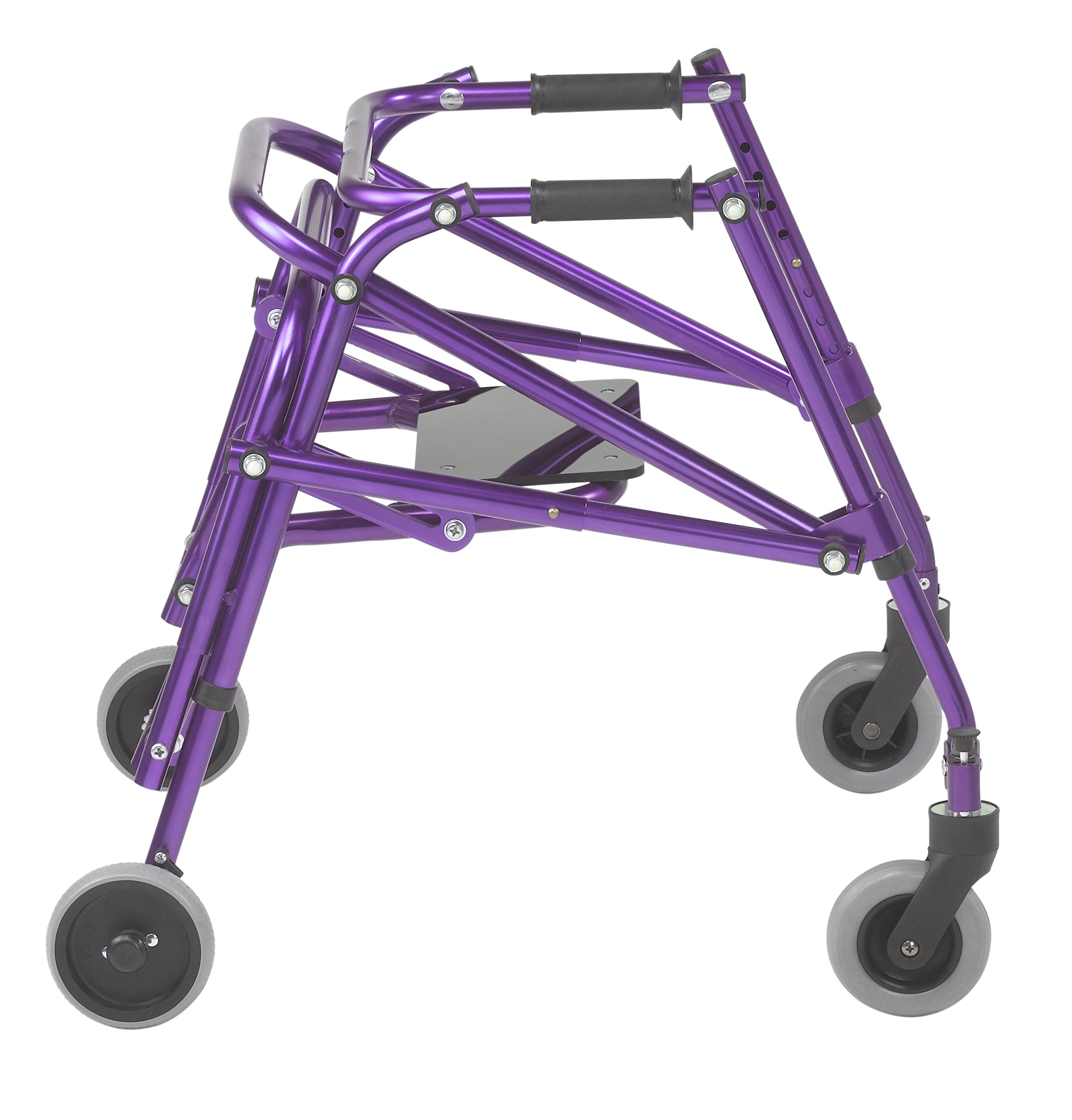 The Nimbo Posterior Walker provides maximum mobility assistance for both adults and children. Choose from five different height settings to experience the perfect customized fit. The Nimbo also features an improved handgrip design for increased comfort, and folds compactly for easy transport and storage. This Nimbo version includes a foldable seat that easily flips down for convenient rest stops, and flips back up to allow continued walking. Available in three new colors. Features and Benefits Height Adjustable Aluminum Frame Easily folds for transport Revised Hand grip design for increased user comfort Soft rubber wheels adhere to any surface and will not allow the Nimbo to slide backwards when using one-directional setting One directional 5" rear wheels with aluminum ratchet and pin mechanism for increased durability One directional override bracket to allow for two directional movement Easily switch from swivel to non-swivel front wheel settings Product Specifications Actual Product Weight: 15 lbs Handle Height (Max): 25" Handle Height (Min): 19" Inside Hand Grip Width: 13.5" Number of Wheels: 4 Overall Product Height: 19" Overall Product Length: 24" Overall Product Width: 27" Primary Product Color: Wizard Purple Primary Product Material: Aluminum Product Weight Capacity: 85 lbs Warranty: 1 Year Limited Model # ka2200s-2gwp