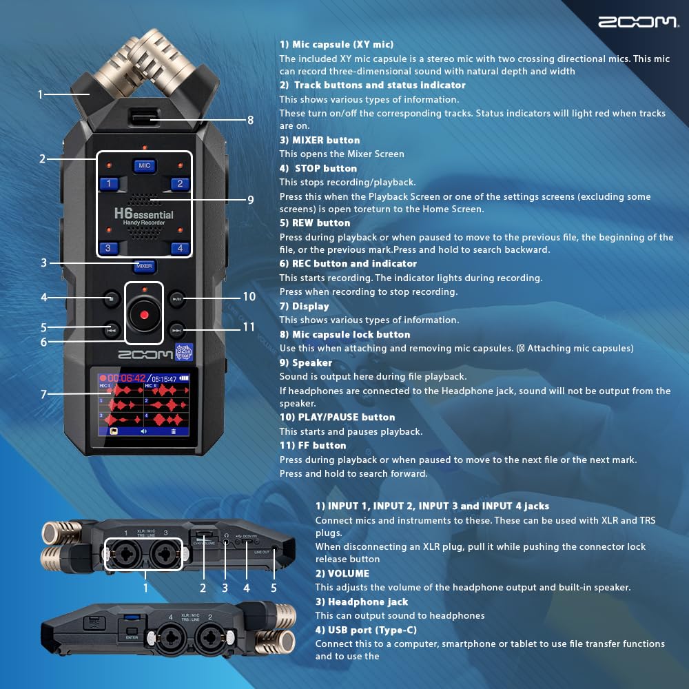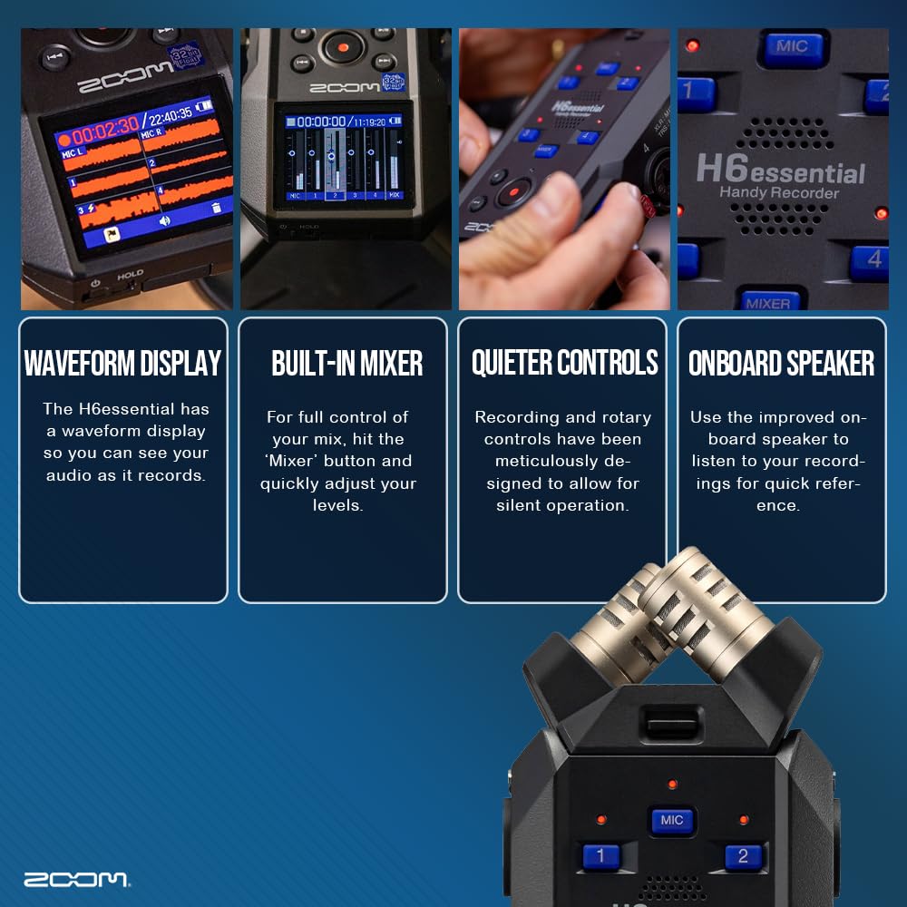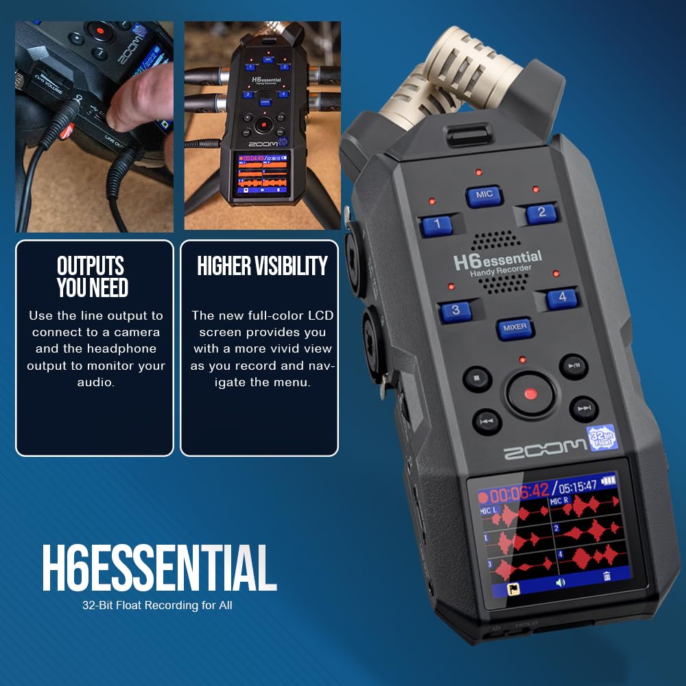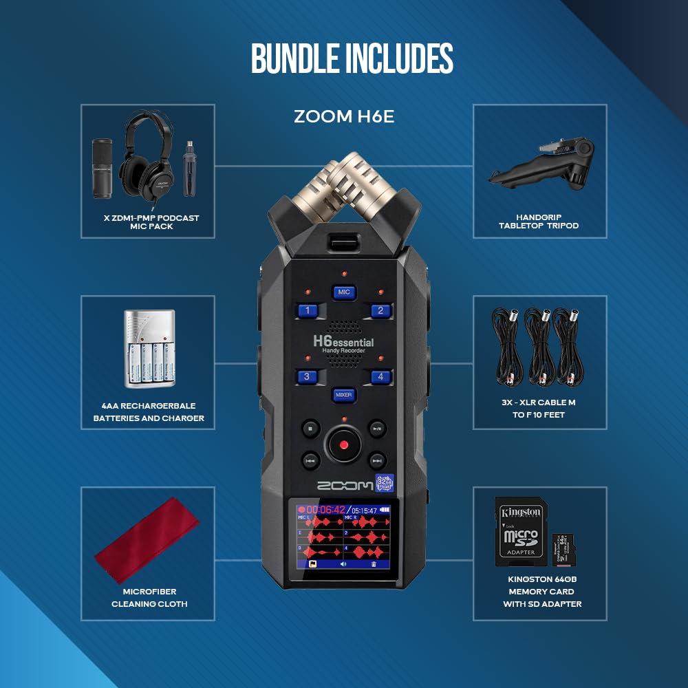 Comprehensive Set – This Zoom H6 Essential portable studio recorder includes SonicSound accessories – 4AA Rechargerbale Batteries with Charger, Microfiber Cleaning Cloth, Handgrip Tabletop Tripod, 64GB MicroSDXC Memory Card with SD Adapter, Podcast Mic Pack with Headphones, Windscreen, XLR, and Tabletop Stand, 3 XLR Cables M to F 10 feet.