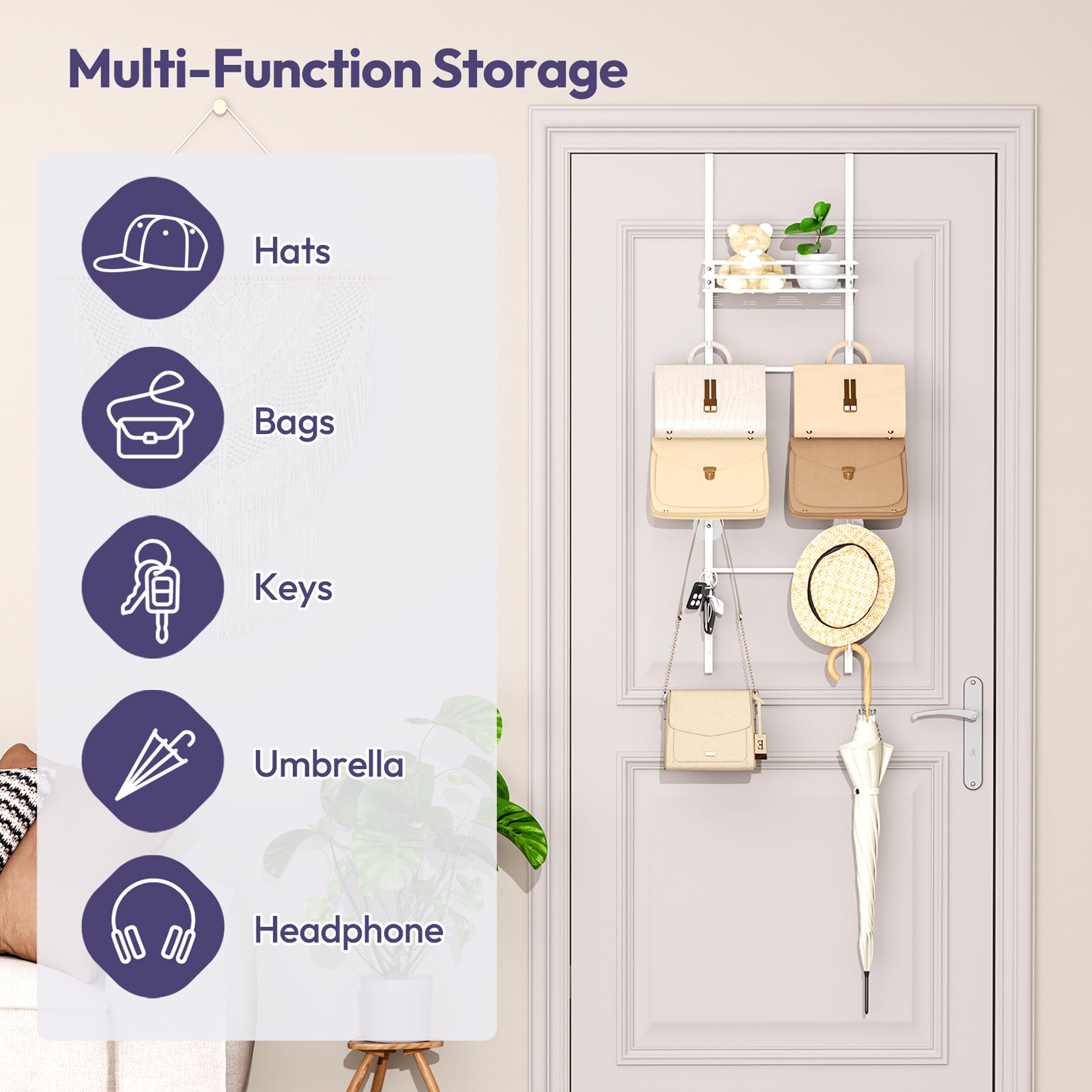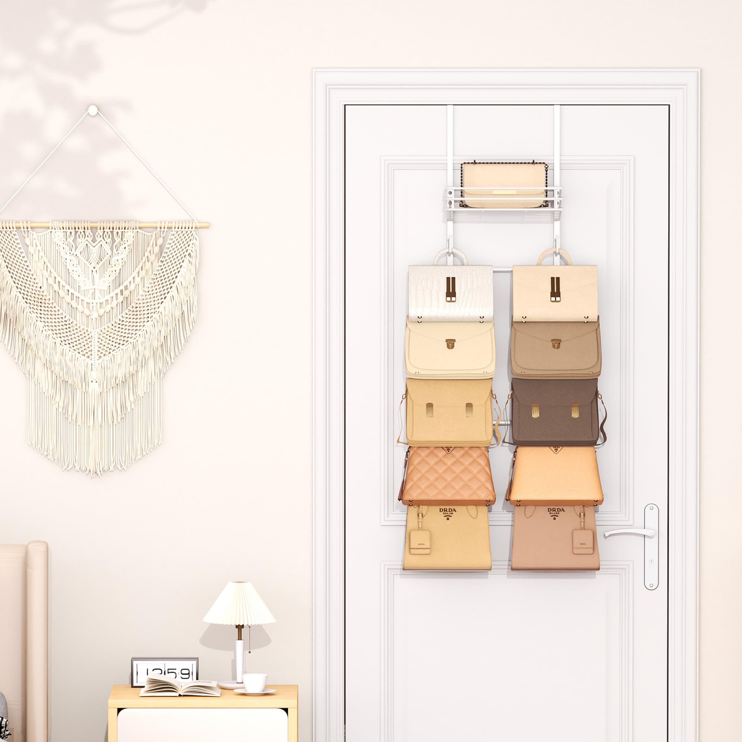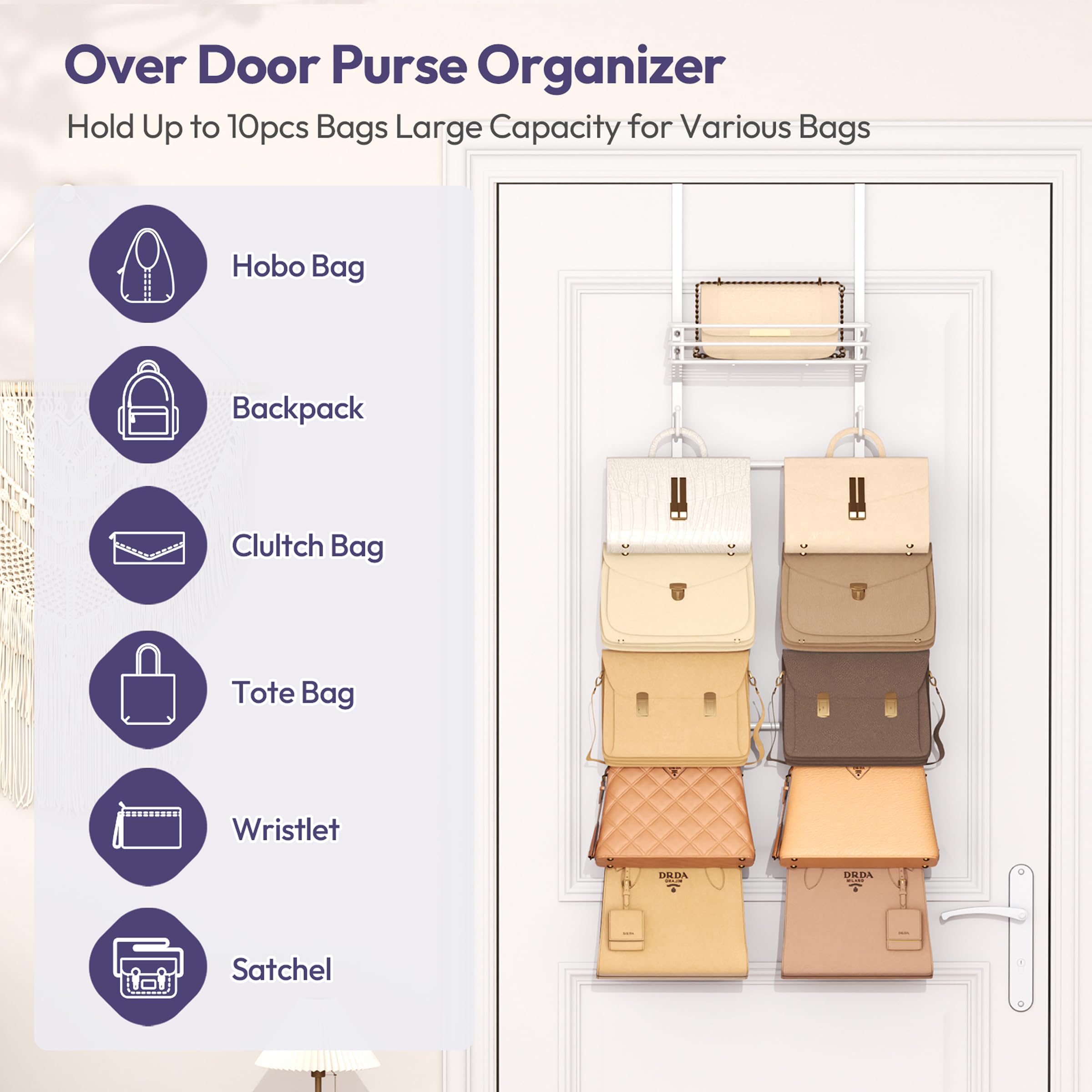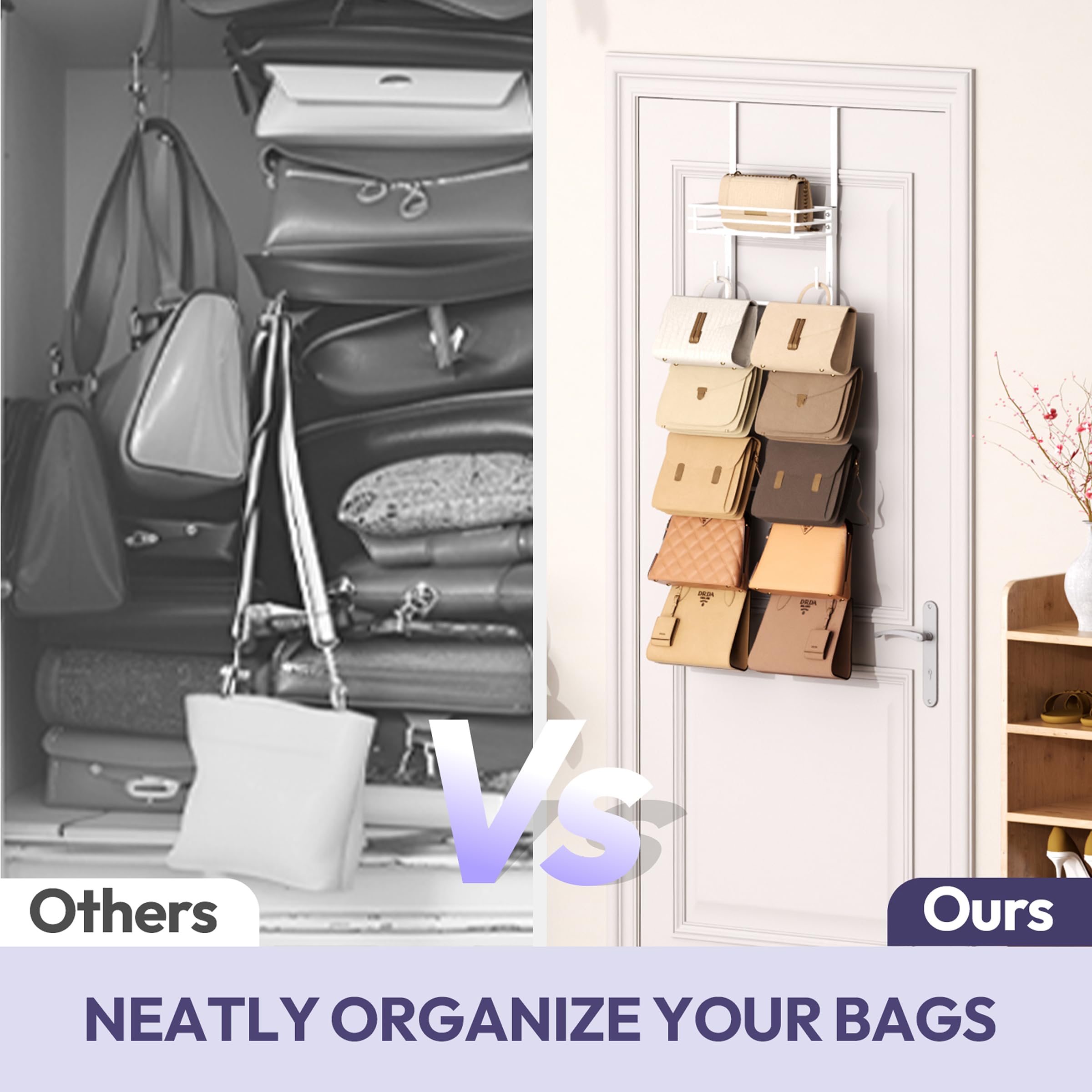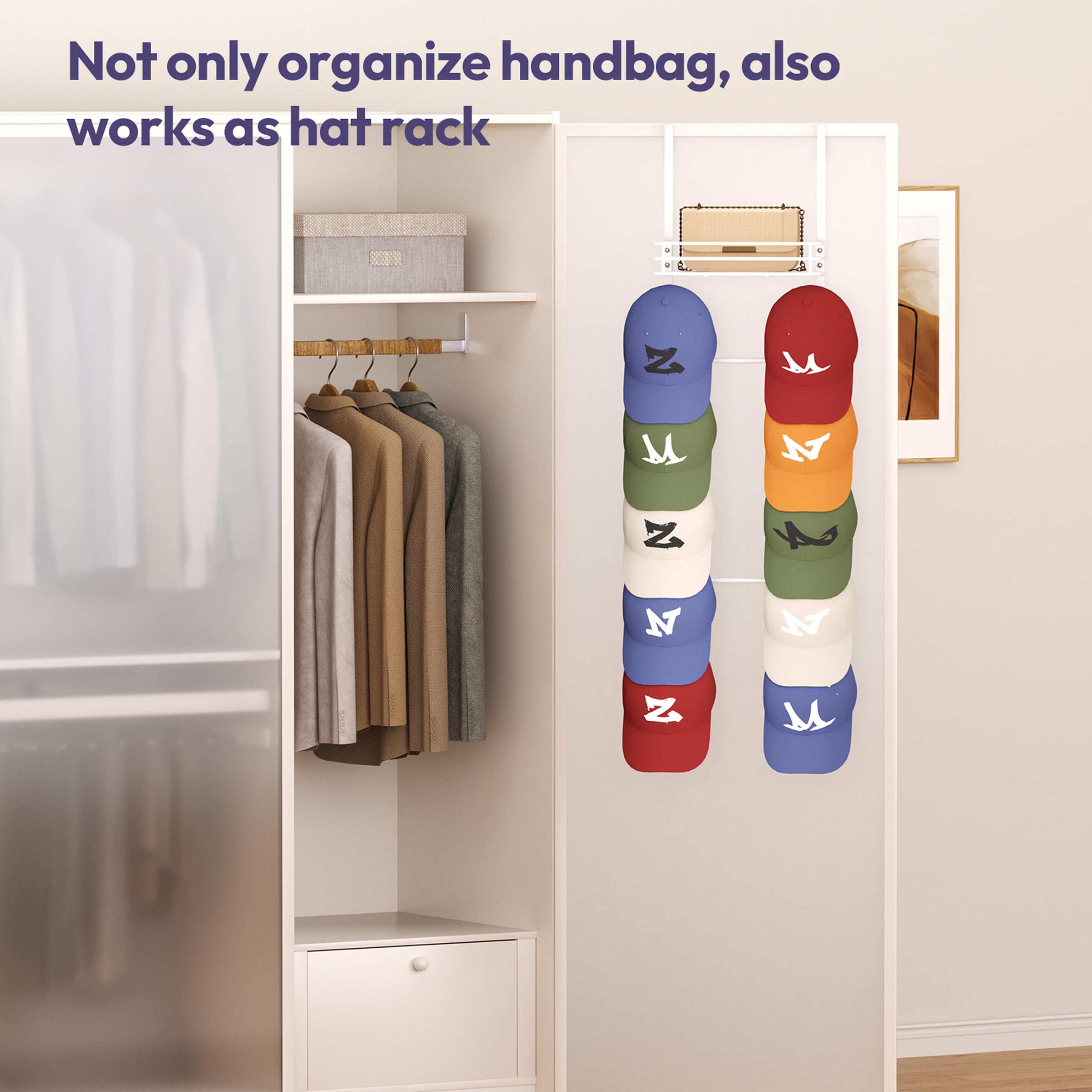 [Secure and Stable]: The over the door handbag organizer includes anti-sway adhesive pads prevents swinging or sliding. Use it as a purse holder for closet or a dependable vertical rack—it keeps everything in place, whether holding a small purse organizer or larger totes