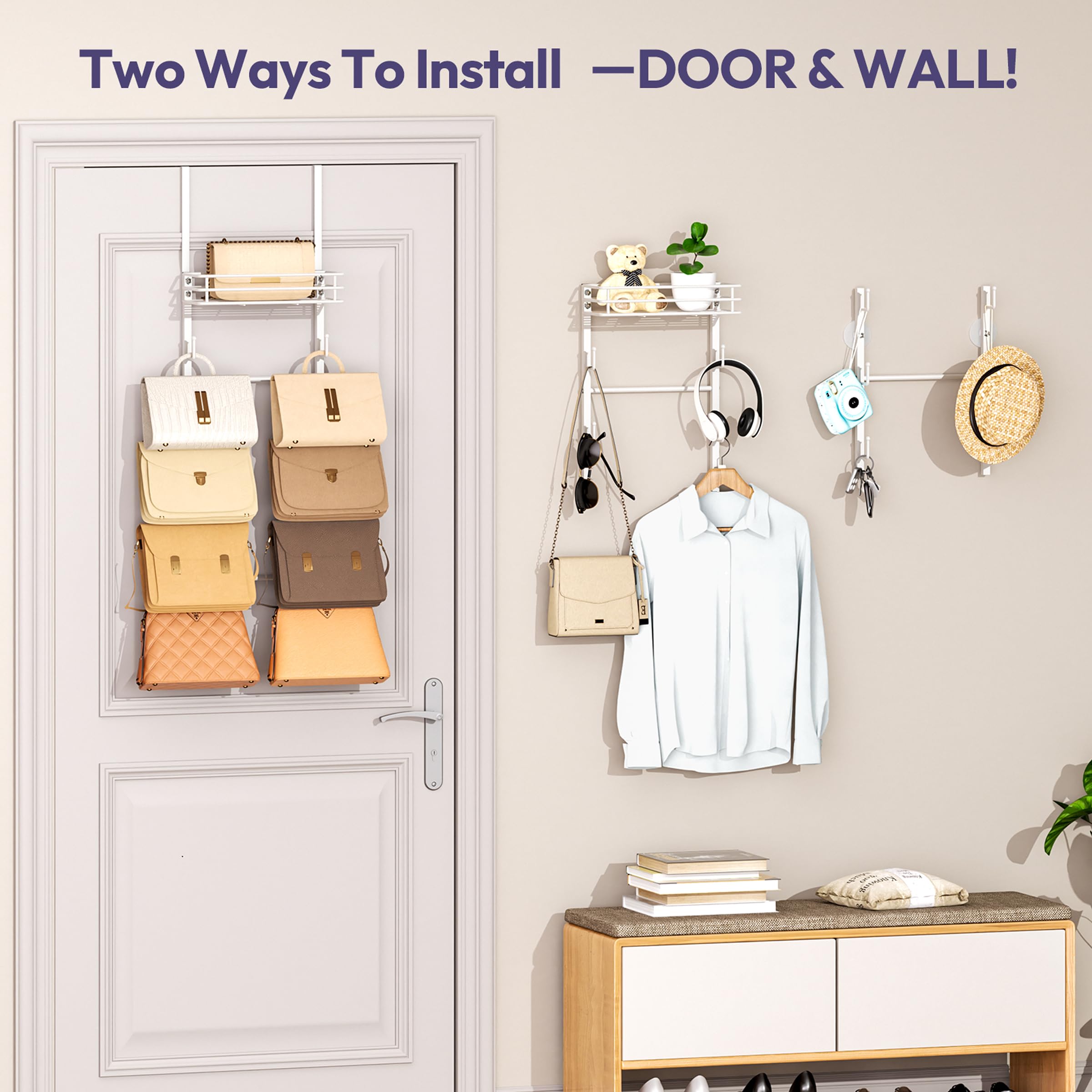 [Dual Installation Modes]: Choose what works for you—hang it over the door or mount it on the wall. This purse storage adapts to your space and style. Whether you're organizing everyday bags or weekend totes, this heavy-duty handbag storage system serves as a durable and elegant purse holder for homes, dorms, and studios