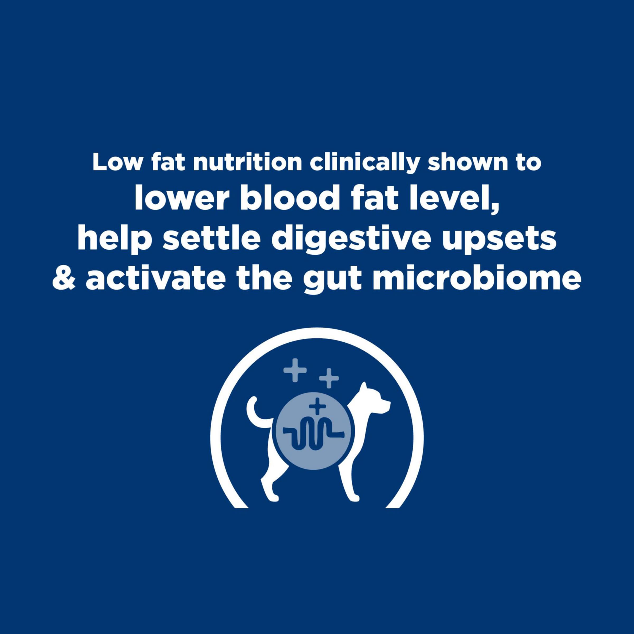 Hill's Prescription Diet i/d Low Fat Dry Dog Food is highly digestible low fat nutrition shown to lower blood fat level to help settle digestive upsets. Fortified with Hill's breakthrough ActivBiome+ ingredient technology, a unique blend of prebiotic fibers, clinically shown to rapidly activate the gut microbiome to support digestive health and well-being. It also includes omega-3 & 6 fatty acids and ginger. Plus, it has clinically proven antioxidants to help support a healthy immune system, and is formulated to promote an environment that makes it difficult for struvite and calcium oxalate crystals to form. It’s made in the USA with global ingredients you can trust, and was developed by Hill’s nutritionists and veterinarians. Please consult your veterinarian for further information on how Prescription Diet foods can help your dog continue to enjoy a happy and active life.