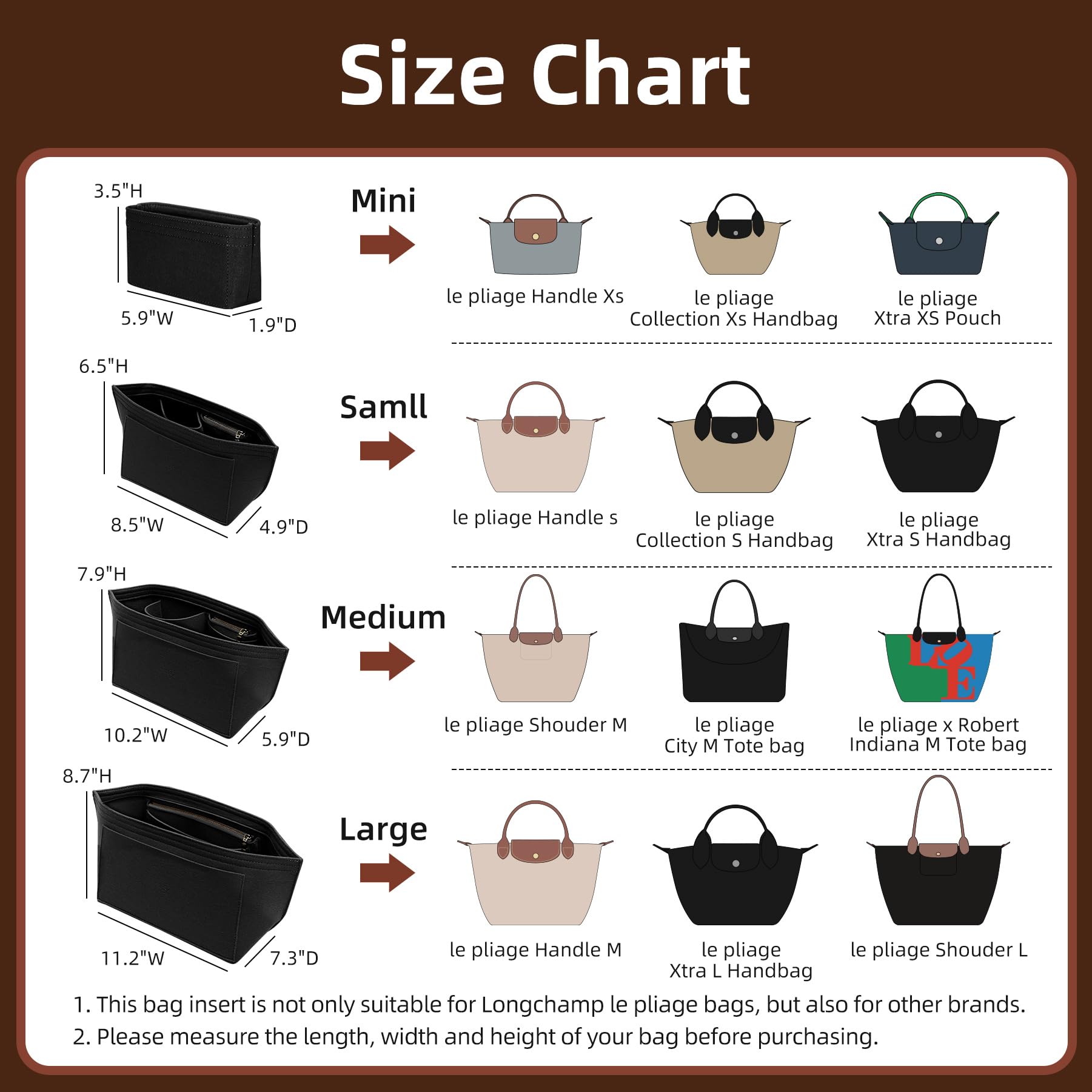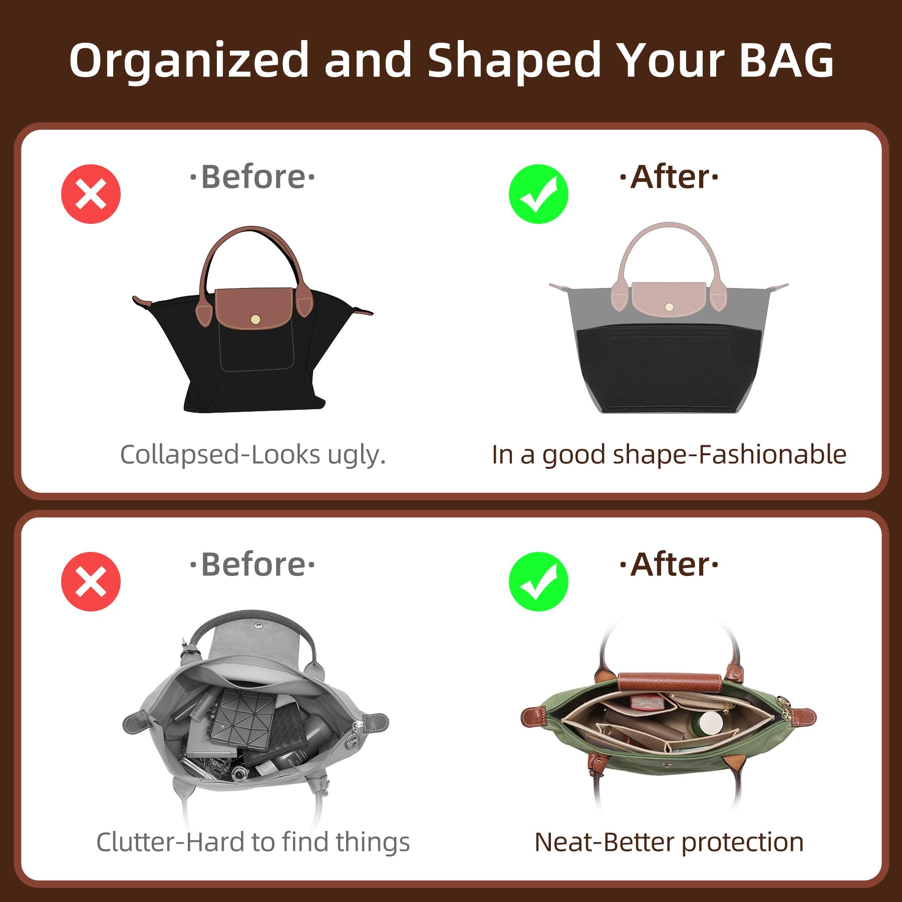 Tailored for Longchamp Le Pliage Bag:Crafted from 10,000+ bags' DNA since 2013 (yes, we measured them all!). Your Bag’s Size MUST BE - (11.2"W x 7.3"D x 7.2"H) (Tolerance <1") (Exact Fit Required),is tailored specifically for Le-Pliage original L, Energy L, Green L, City L tote bags, and Extra L handbags, We do NOT support any similar bags or unauthorized versions