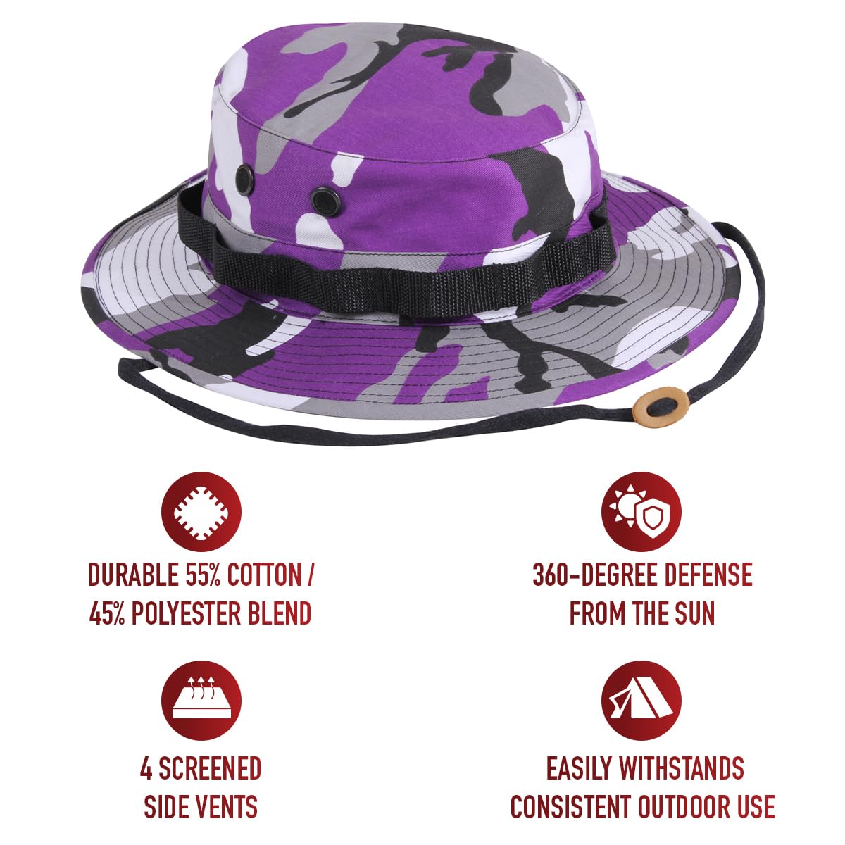 Description Explore the outdoors with Rothco's Classic Boonie Hat. Made from durable cotton rip-stop material, the bucket hat features loops for leaves, side vents for airflow, and an adjustable chin strap. A perfect blend of functionality and style for your outdoor adventures.