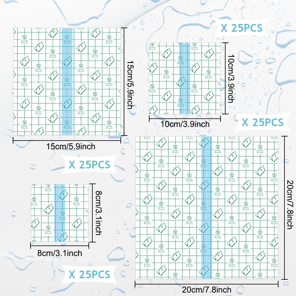 PACKAGE CONTENT: This waterproof bandages for swimming include 100 bandages of 4 size 2x2 inch,4x4 inch,6x6 inch and 8x8inch, moderate size, no need to cut, ready to use, easy to store and carry, 50 waterproof tape for skin can meet the daily use needs of you and your family, waterproof medical tape is a necessary daily use tool for the family!