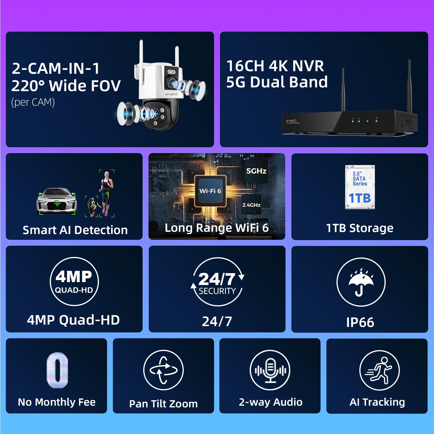 ใ๐๐ฟ๐ฒ๐ฒ ๐ฅ๐ฒ๐บ๐ผ๐๐ฒ ๐ฉ๐ถ๐ฒ๐ & ๐๐๐น๐น ๐ฆ๐ฒ๐ฐ๐๐ฟ๐ถ๐๐ ๐๐ฒ๐ฎ๐๐๐ฟ๐ฒ๐ใScan QR to add NVR to free XMARTO app; view on phone/Pad/PC/Mac/Alexa anytime, anywhere. 1TB HDD stores months of video free (no fees, cloud optional); instant motion/human detection alerts. 24/7 5G dual-band WiFi (power only, no cables); 2-way audio + siren alarm; IR/floodlight night vision (IR/Color/AUTO modes).