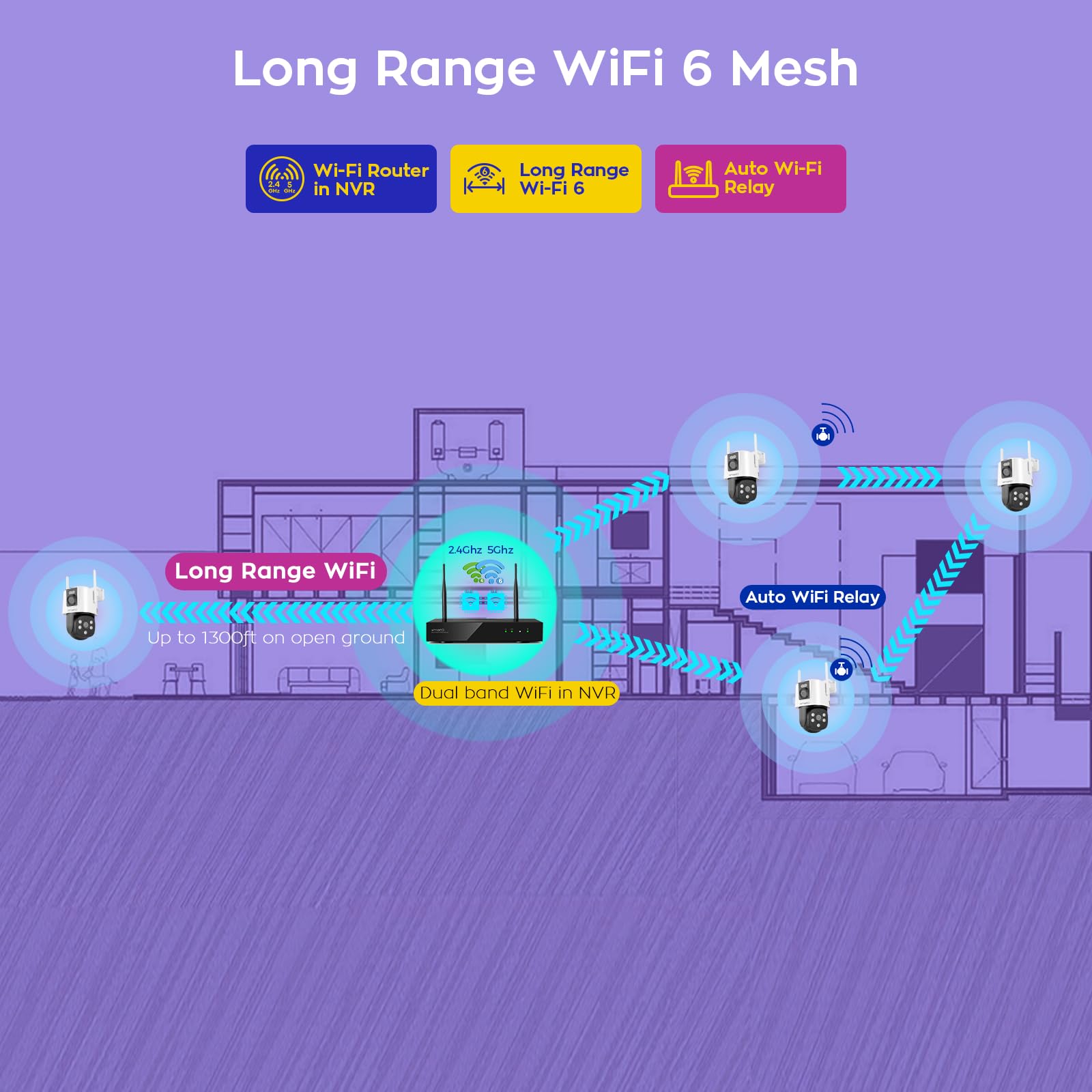 ใ๐ช๐ถ๐ณ๐ถ๐ฒ ๐ ๐ฒ๐๐ต & ๐ญ๐ฏ๐ฌ๐ฌ๐ณ๐ ๐๐ข๐ฆ ๐๐ผ๐ป๐ด ๐ฅ๐ฎ๐ป๐ด๐ฒใ16CH 4K NVR with built-in WiFi6 router creates a self-built mesh networkโ0 home WiFi load, works without Internet. Weak-signal cams use closer ones as repeaters; 1300ft (400m) i๐ป ๐๐ถ๐ป๐ฒ ๐ผ๐ณ ๐ฆ๐ถ๐ด๐ต๐, (๐๐ข๐ฆ) range, hundreds of feet indoors with walls.