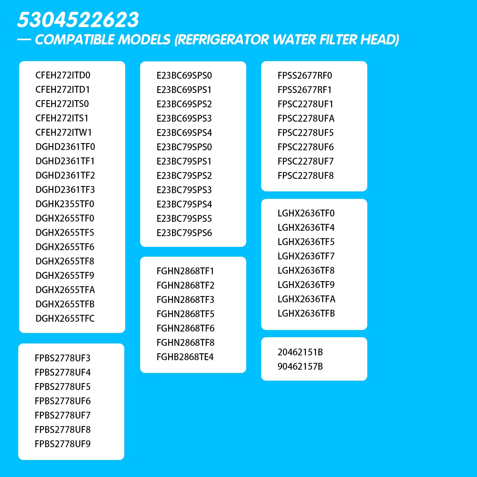 Compatibility (3/3) — Further compatible models for this 5304522623 refrigerator water filter head: 20462151B, 90462157B, CFEH272ITD0, CFEH272ITD1, CFEH272ITS0, CFEH272ITS1, CFEH272ITW1, DGHD2361TF0, DGHD2361TF1, DGHD2361TF2, DGHD2361TF3, DGHK2355TF0, DGHX2655TF0, DGHX2655TF5, DGHX2655TF6, DGHX2655TF8, DGHX2655TF9, DGHX2655TFA, DGHX2655TFB, DGHX2655TFC, E23BC69SPS0, E23BC69SPS1, E23BC69SPS2, E23BC69SPS3, E23BC69SPS4, E23BC79SPS0, E23BC79SPS1, E23BC79SPS2, E23BC79SPS3, E23BC79SPS4, E23BC79SPS5, E23BC79SPS6.