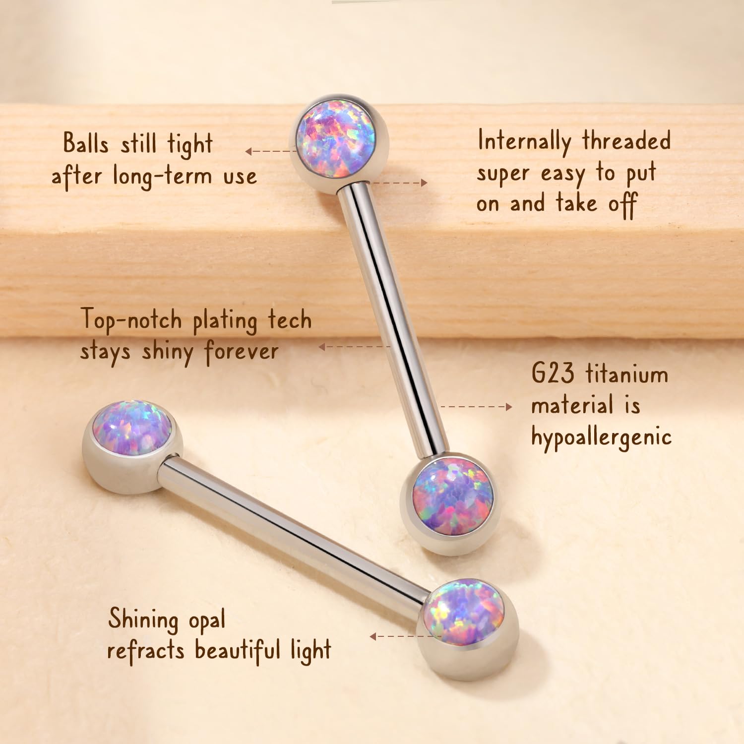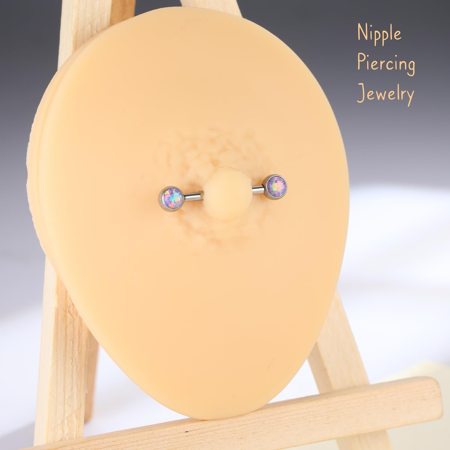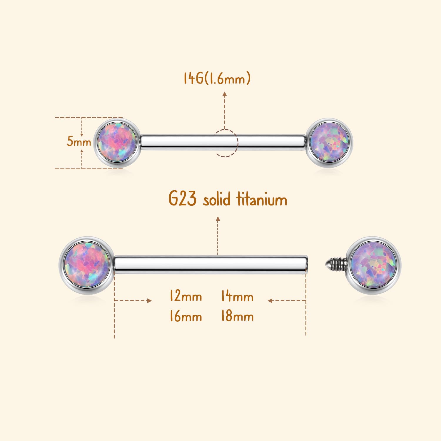 Size and Color:Gauge:14g nipple rings,Nipple Barbell Length:5/8"(16mm) Opal Size:5mm.Color: Silver+Purple Opal