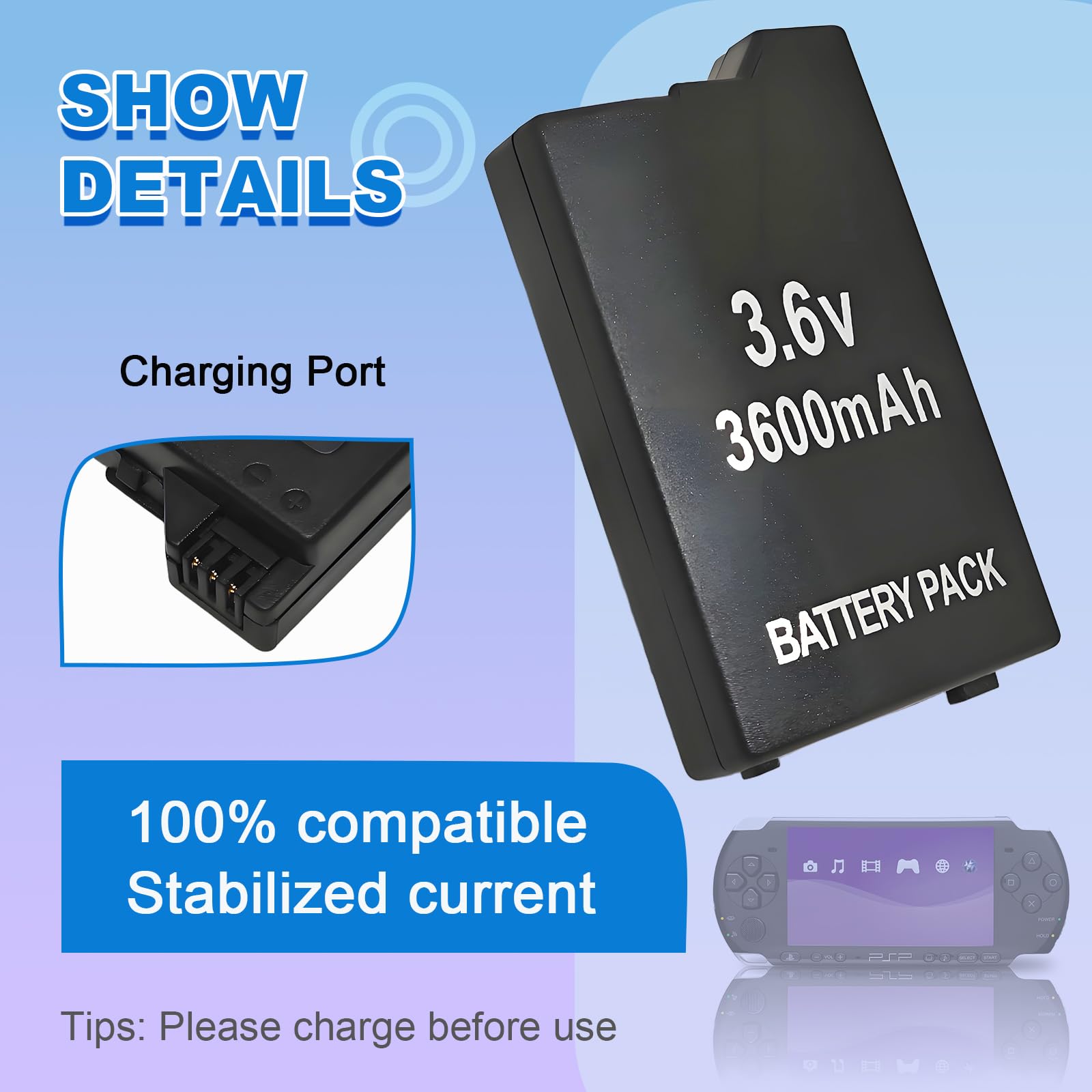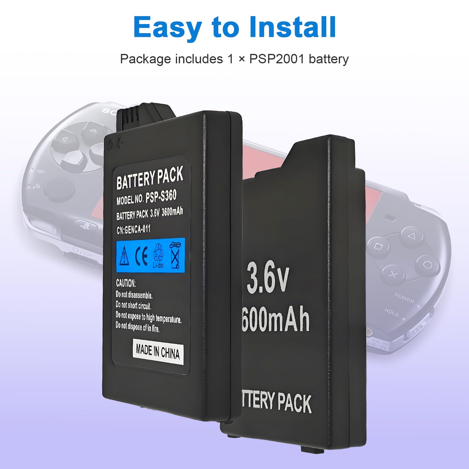 Easy to install: Package includes 1 × PSP2001 battery. Tips: The first three cycles of use require complete charging and discharging to improve battery life