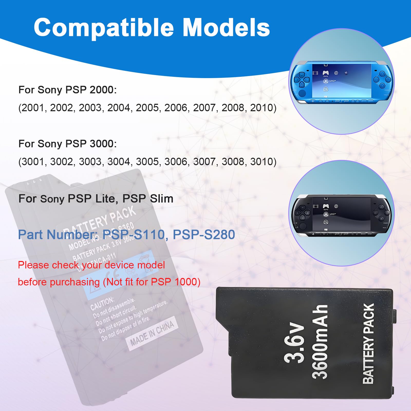 For PSP S110 Battery: Compatible with Sony PSP 2000/3000 series, PSP Lite, PSP Slim game player battery