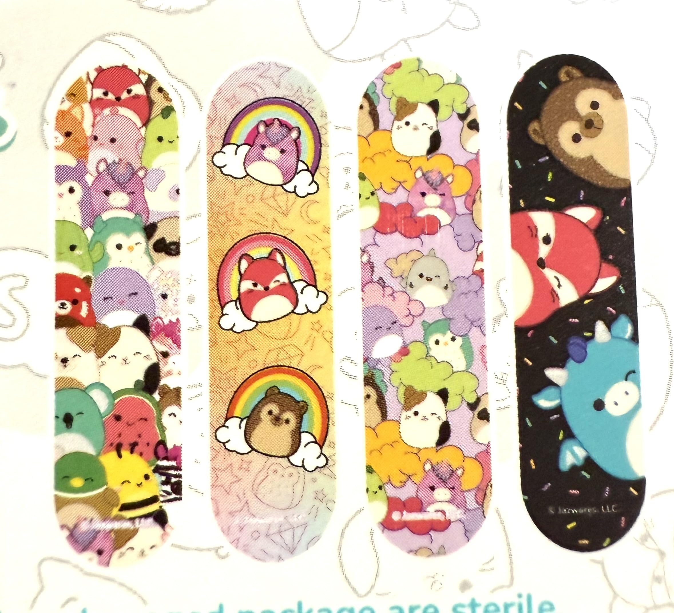 Make minor scrapes and cuts more fun with Smart Care Squishmallows Adhesive Bandages! This adorable pack includes 20 regular-shaped bandages featuring beloved Squishmallows characters like the winking cat, friendly bear, cute fox, and magical unicorn. These latex-free bandages are perfect for kids and anyone who loves these popular plush characters. The cheerful designs help turn tears into smiles while providing reliable wound coverage. Each bandage features a strong adhesive that stays in place while remaining gentle on skin. The convenient box packaging makes it easy to store in medicine cabinets, diaper bags, or first aid kits. Transform everyday minor wound care into a delightful experience with these charming character bandages that combine practical protection with playful designs.