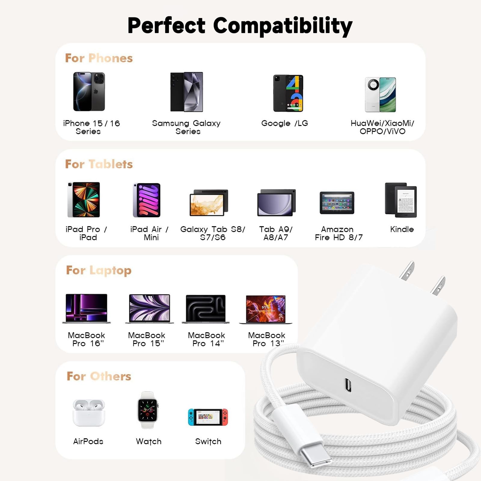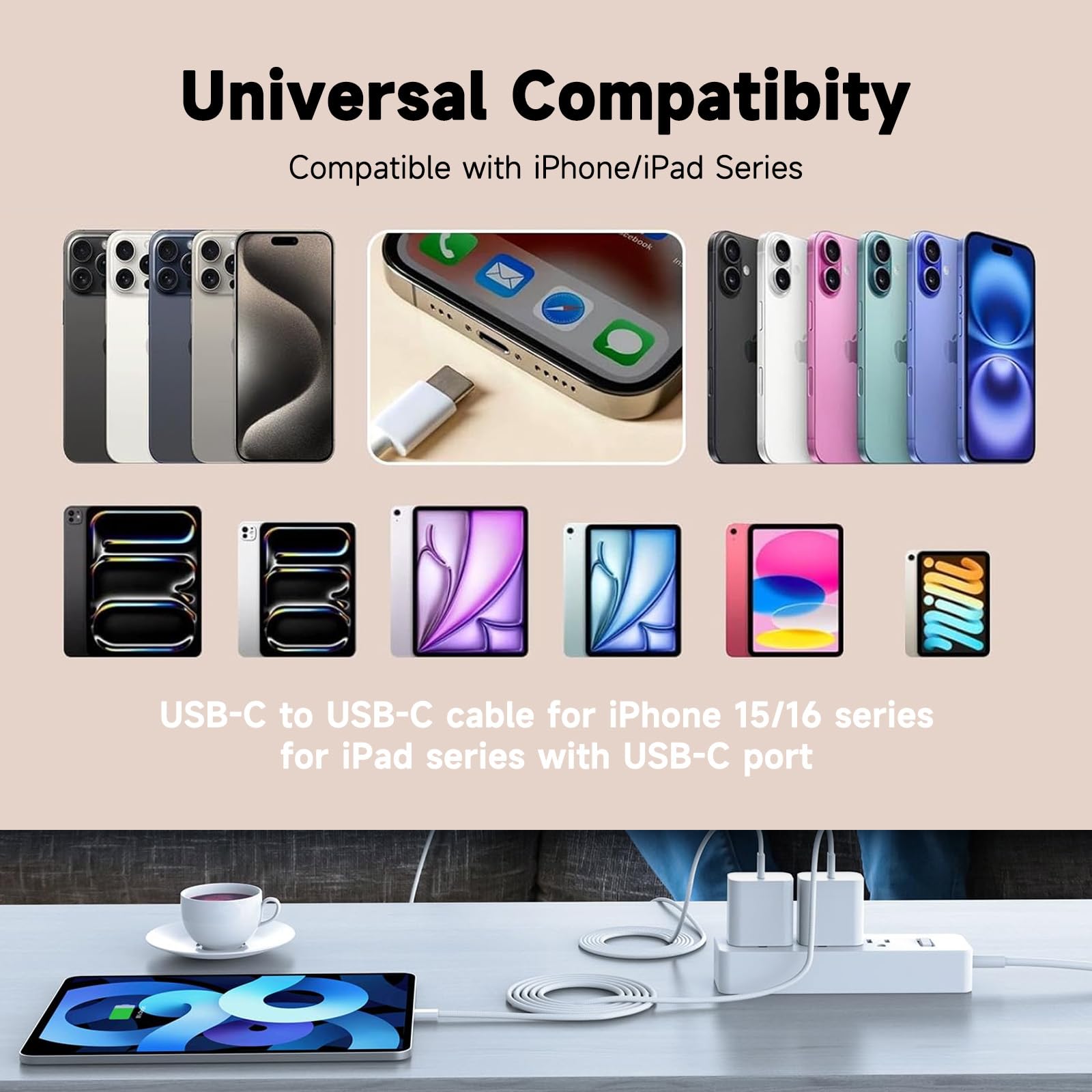 Compatible Phone Models: Phone 16e 16/16 Plus/16 Pro /16 Pro Max /Phone 15/15 Pro/15 Pro Max/15 Plus;, 2022/2021/2020/2018, Pad Pro 12.9/11 inch 6th/5th/4th/3rd, 2022 new iPad 11 A16 2025, Pad 10th Generation, Pad Air 5th/4th, Pad Mini 6 and more USB-C devices.