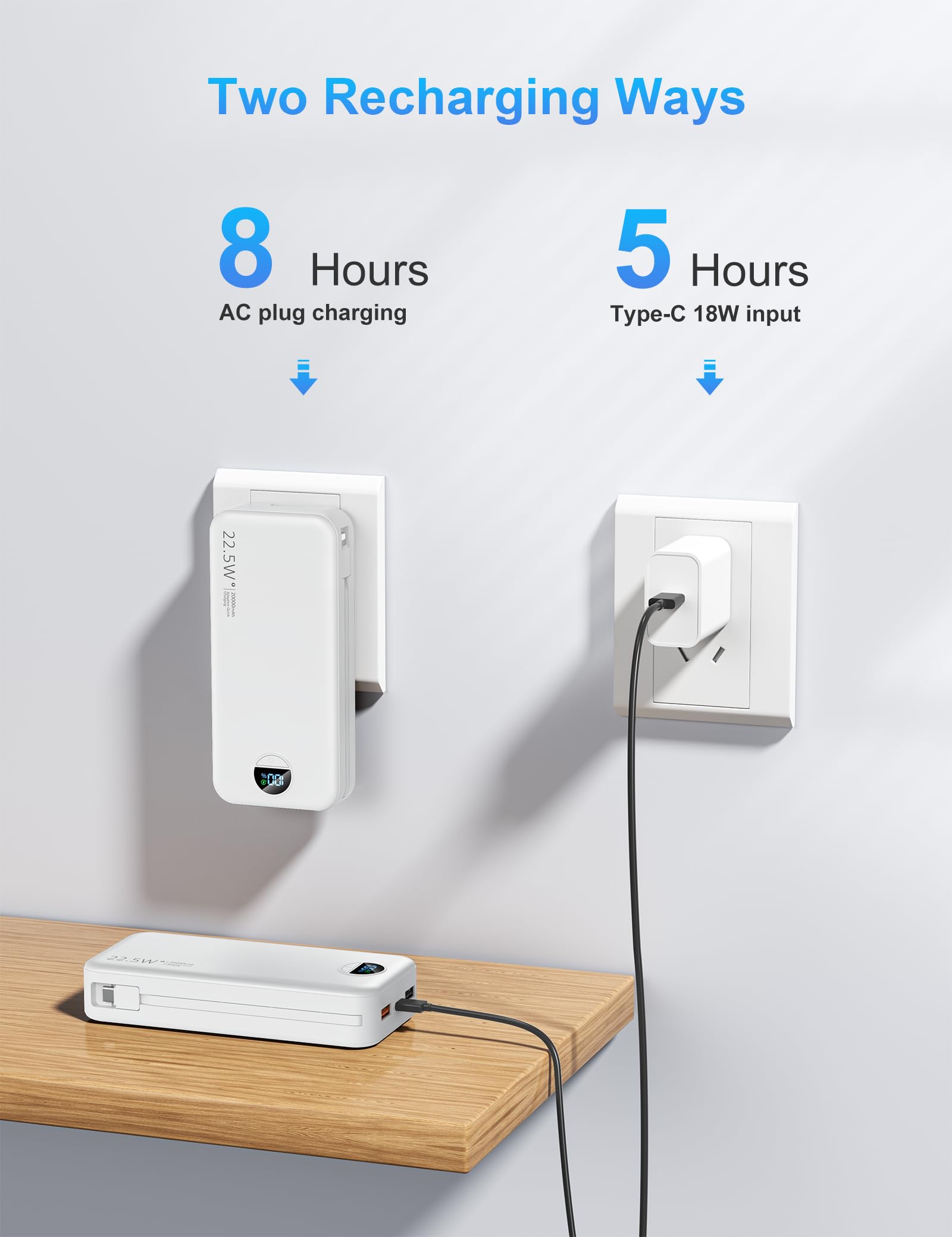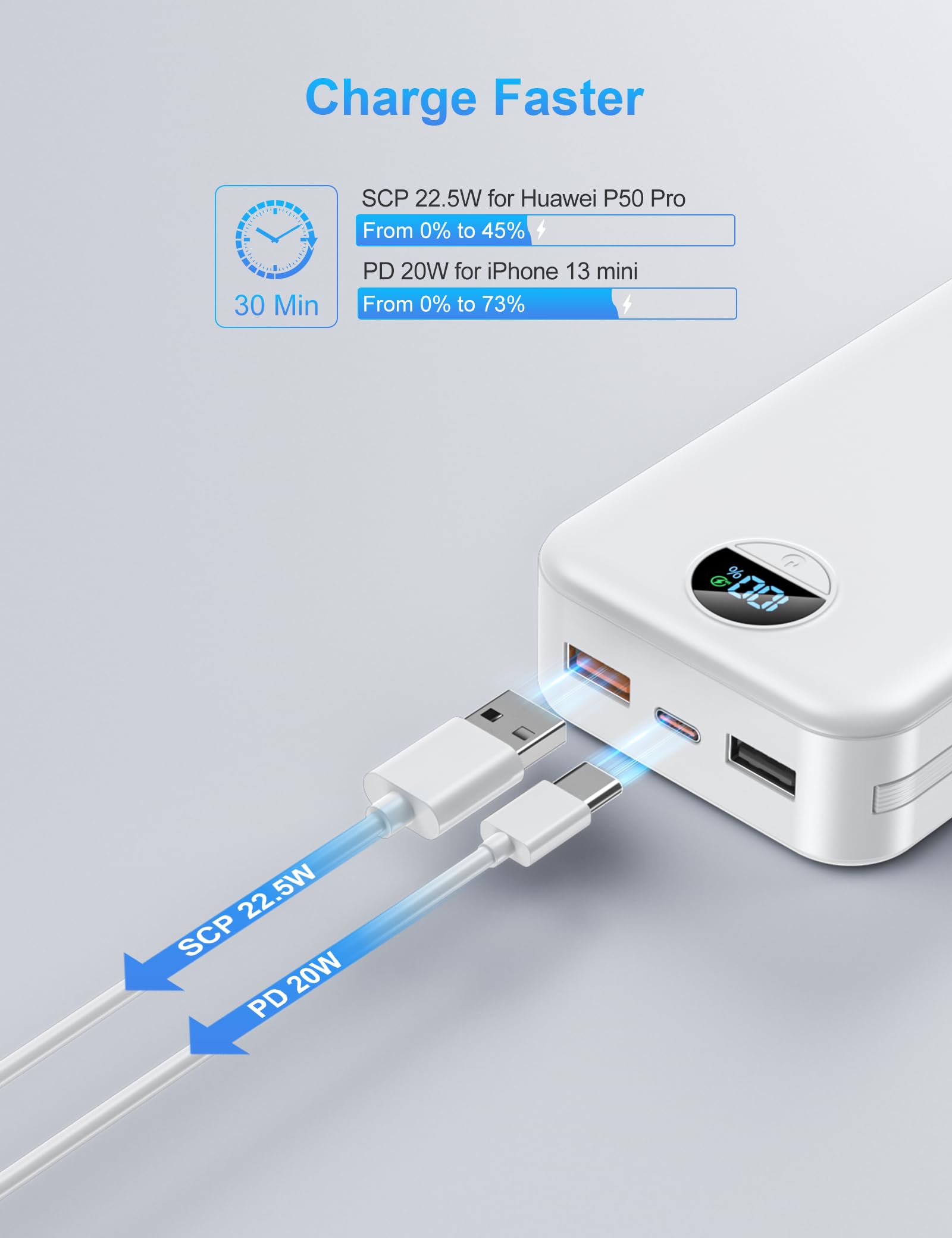High Speed Battery Bank: USB C output port can full charge Phone 12 Pro within 50 min, the inbuilt Type C cable support 18W power deliver, charge Galaxy S10 to 50% in 35 minutes, USB-A2 only need 1 hour to charge an Phone 14 with it’s 22.5W fast charging, our phone charger portable refill 5 devices simultaneously.