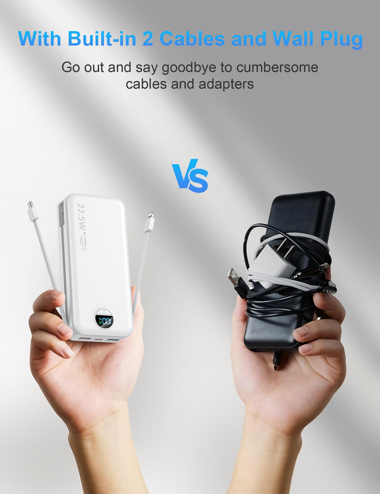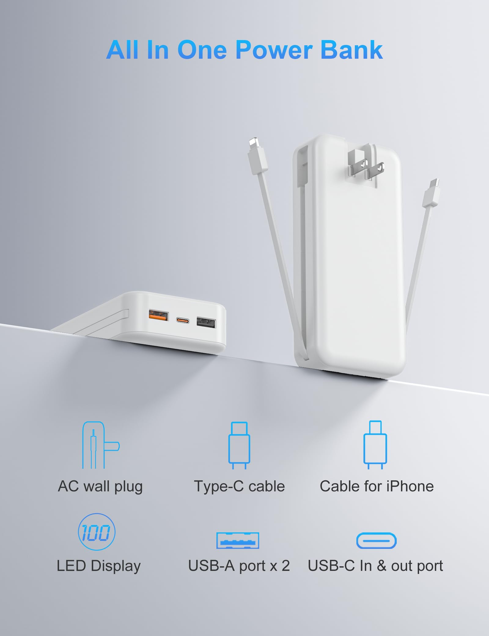 Portable Charger with Built in Cables: portable phone charger built in USB C and for Phone cables, the AC wall plug allows you to recharge this power bank from wall outlet, no need other cord and adapter wherever you go, camping, traveling essentials, excellent gifts for men women daily working or vacation.