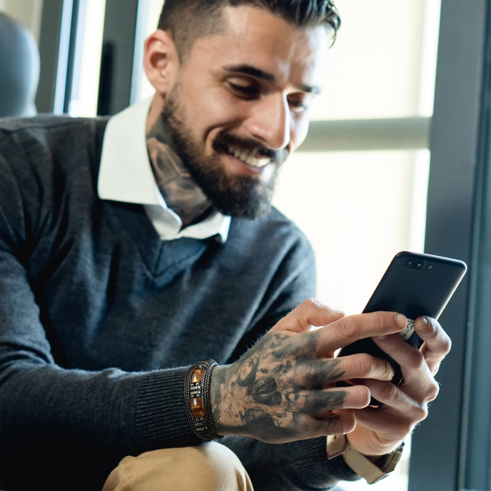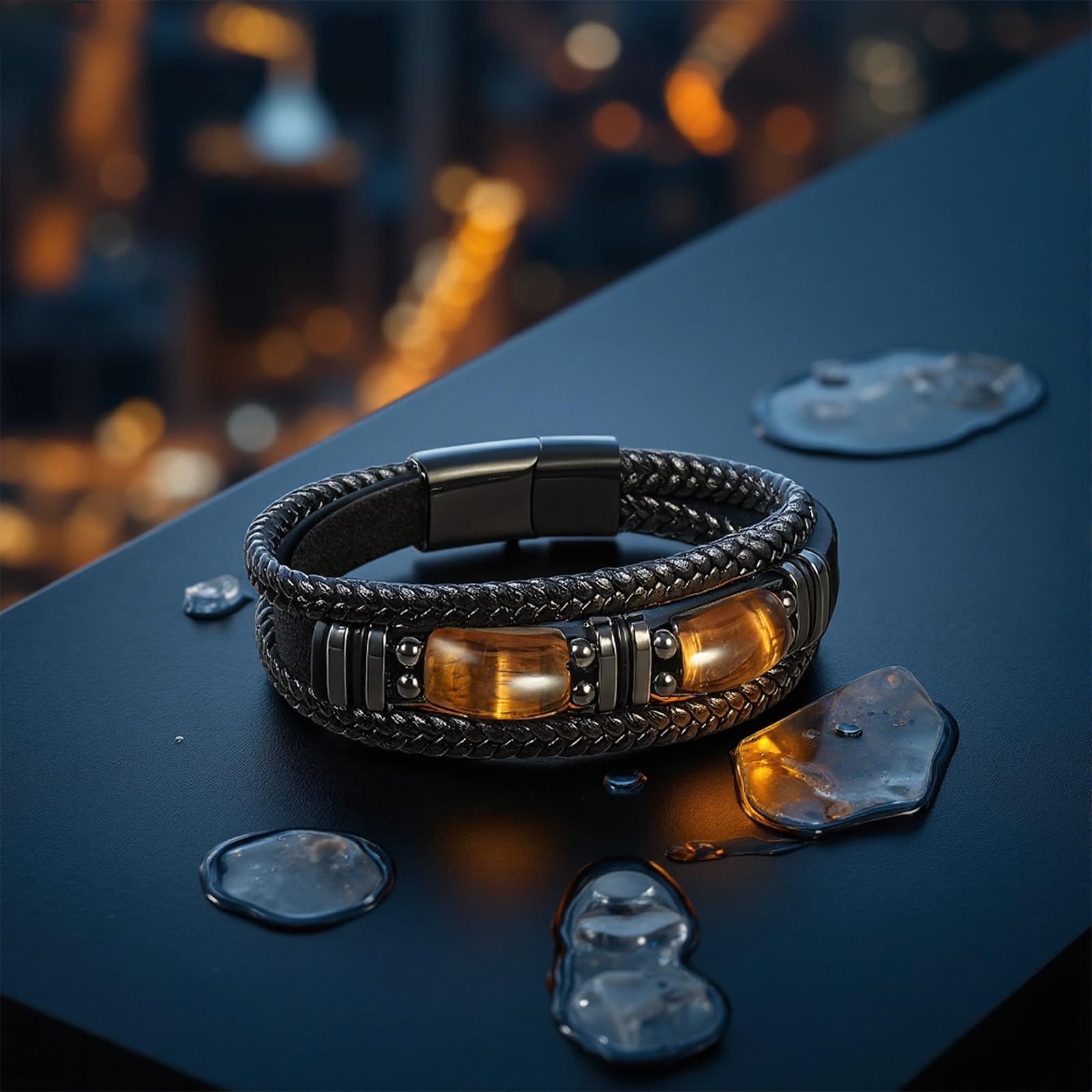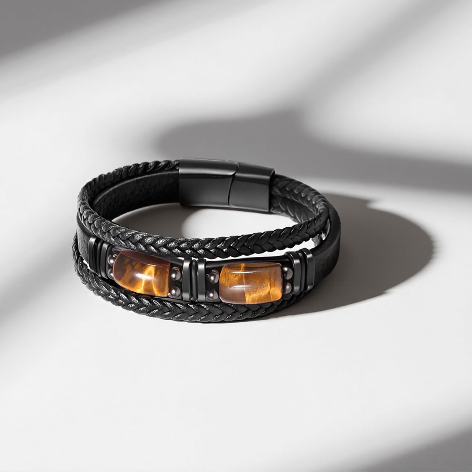【Black Leather Bracelet】Fusing leather and natural tiger eye stone with a classic black design, transcends passing trends. It only grows more unforgettable with time.