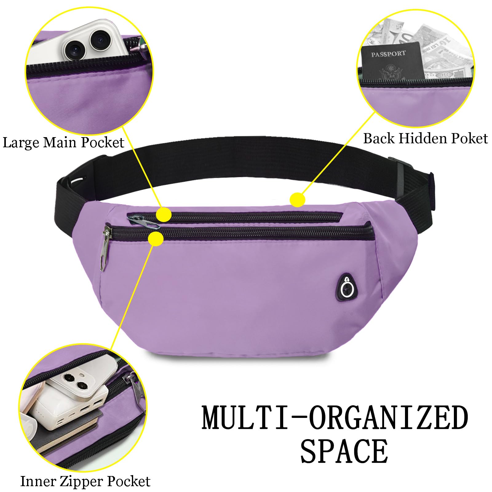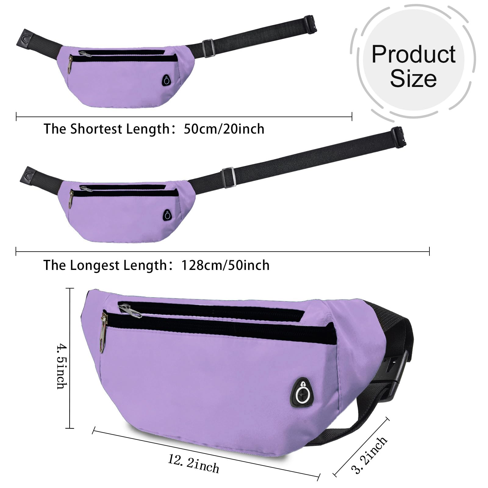 Large Capacity:The Fanny Pack size is about 12.2"x4.5" x 3.2" with 3 zippered pockets,Include main pocket,front pocket and back pocket.You can put your mobile phone, key, headset, headset, sunglasses, cosmetics, wallets, passports, etc.
