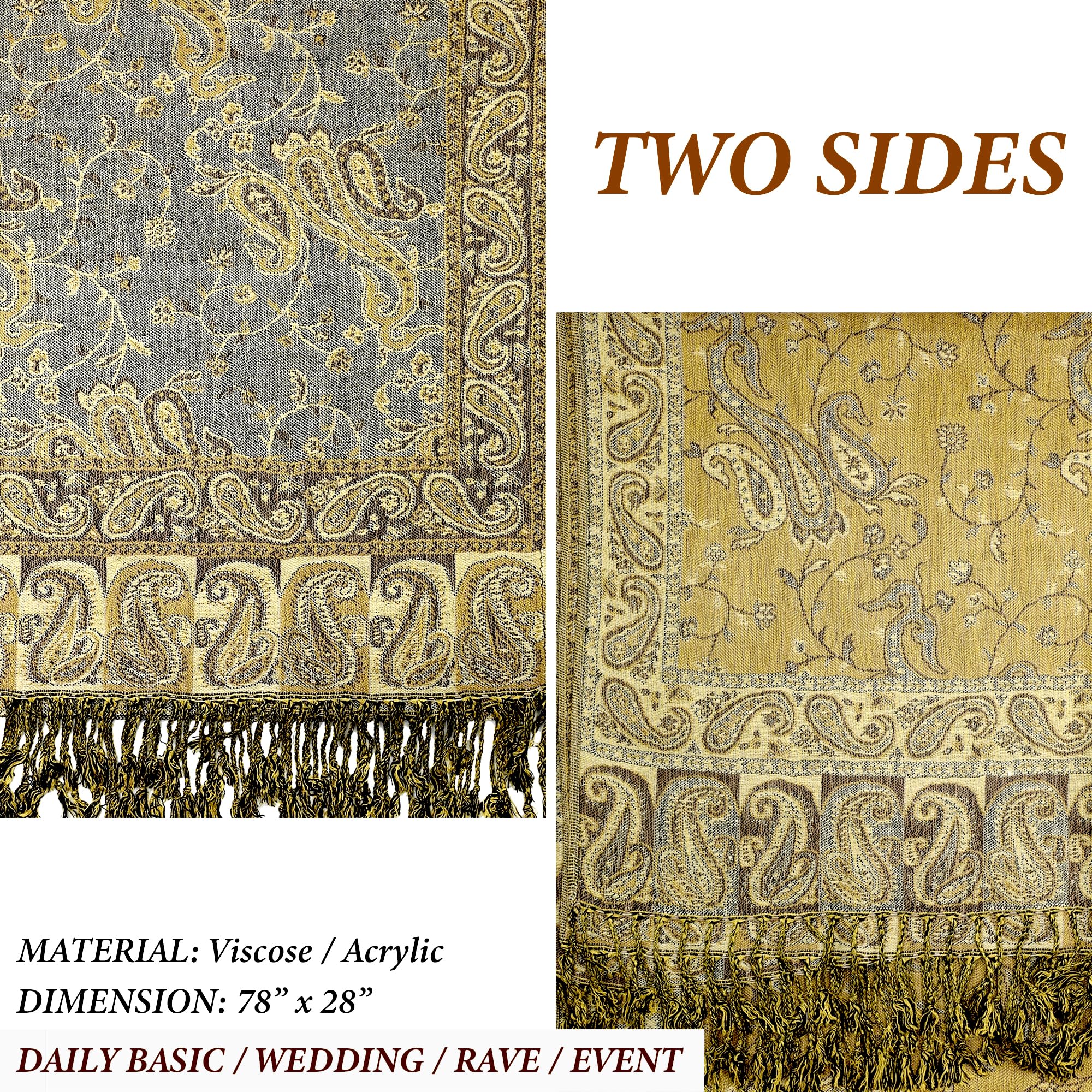 ✔️ Exotic Tapestry Look with Reversible Design – This reversible paisley shawl wrap for women features two beautiful color tones in one piece. It complements everything from evening gowns to rave outfits for men and women, offering vibrant style with graceful comfort.