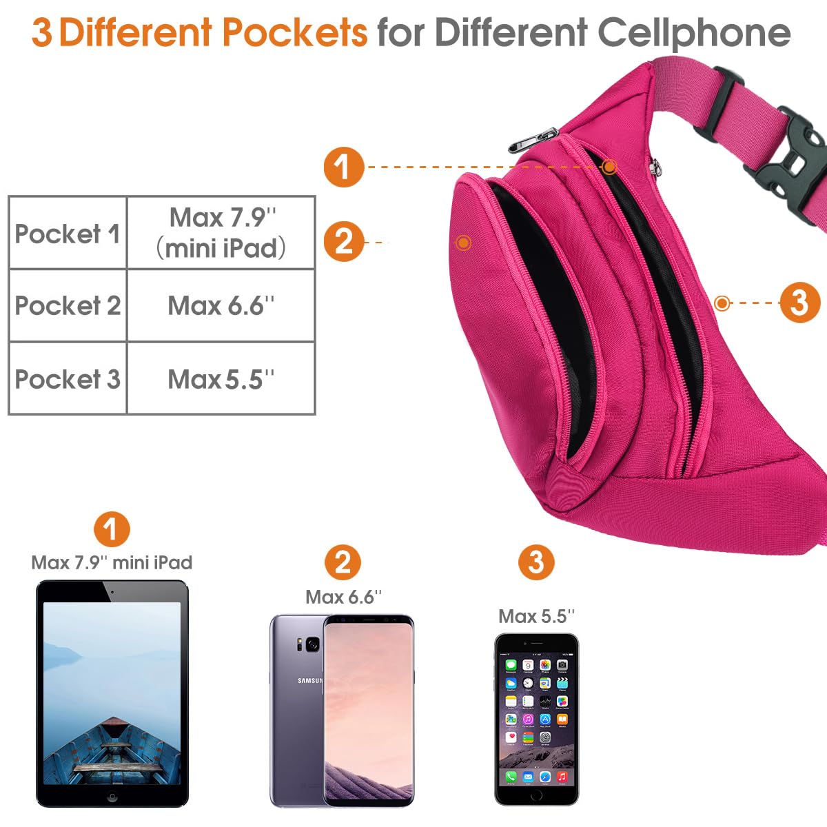 【Large Crossbody Fanny Pack for Women Men】3 pockets waist bag pack:big enough to carry MAX 7.9''iPad or 6.6''cellphone like iPhone X/8/7/6S Plus or Galaxy S9/8/7/6,cards, single keys,or hold a 500ml water bottle while running,working,travelling,workout or dog walking.Hands-Free and enjoy a better festival time.