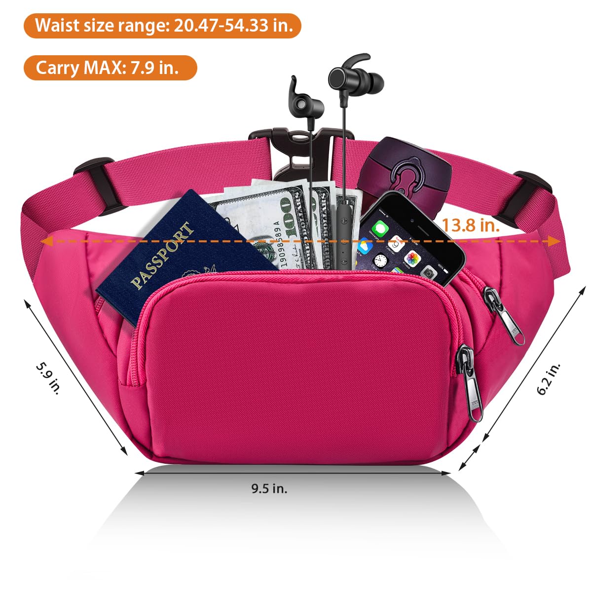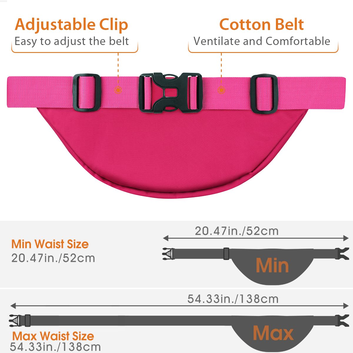 【Adjustable large capacity fanny pack with extended belt packed in the front pocket】This cool Waist Bag Pack for women men can be adjust widely with waist range from 52cm to 138cm(20.47-54.33 Inches),easy to adjust the length of Belt bag as your request by the quick release buckle,you can wear this fanny pack in front of your waist,back on your hip,over the shoulder or under your arm.