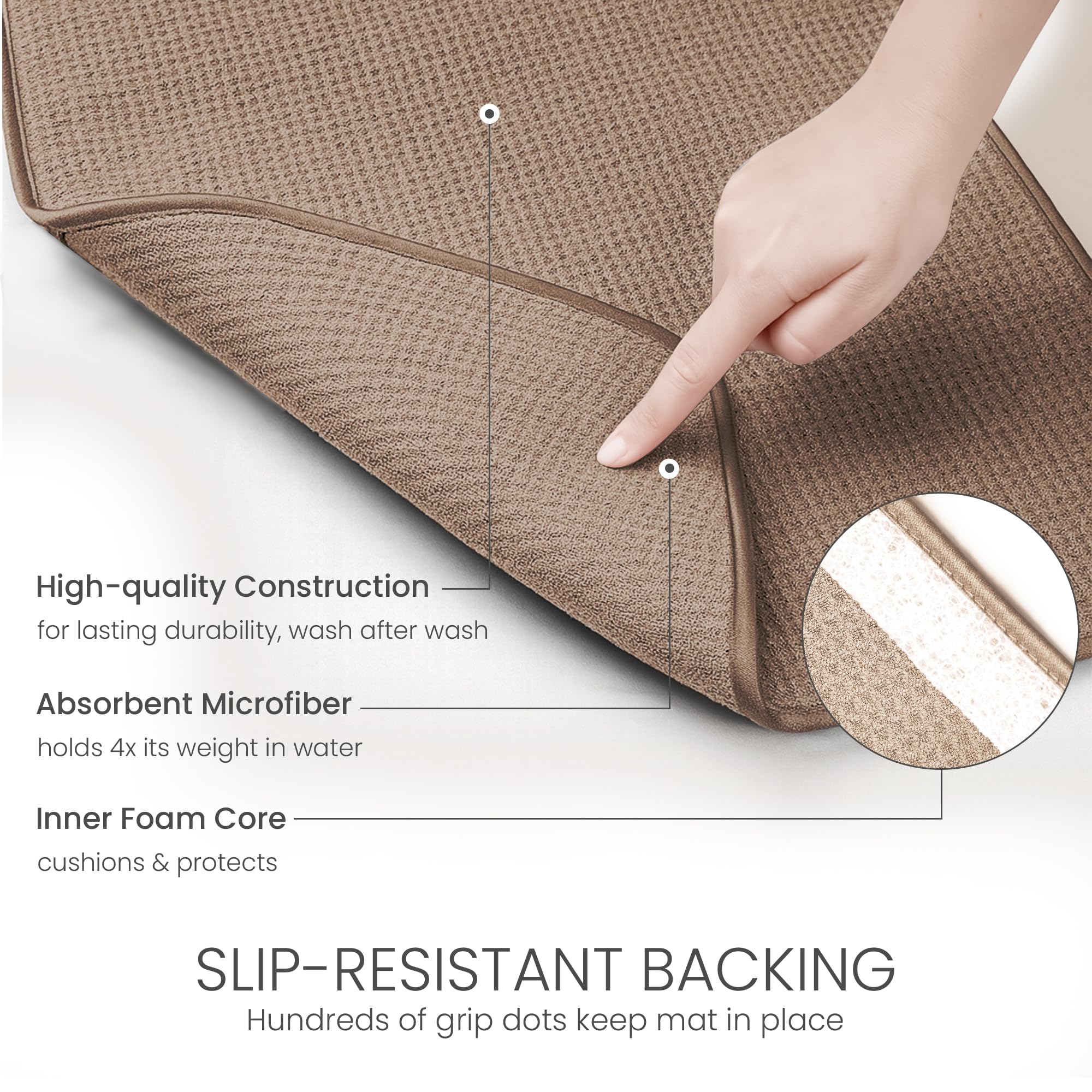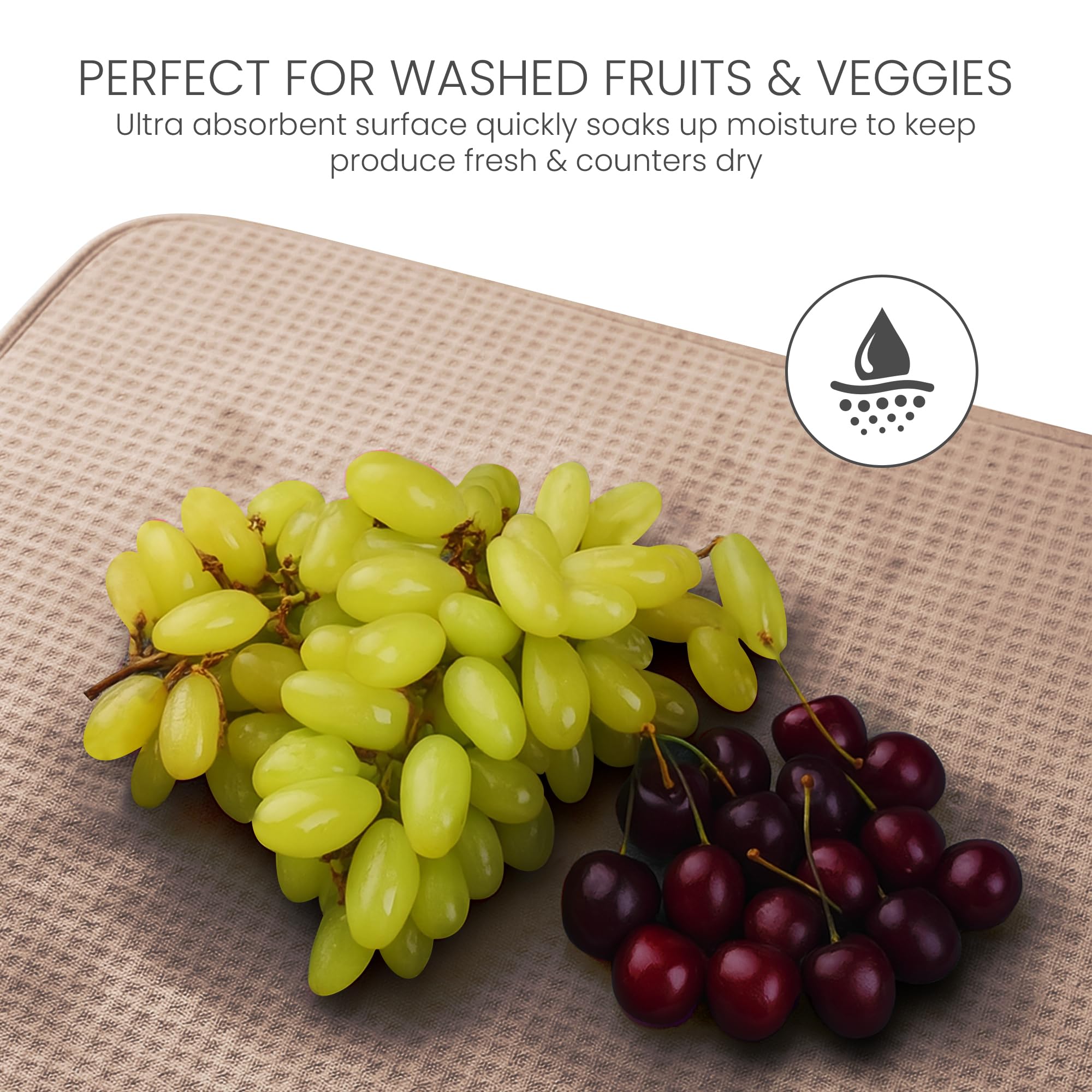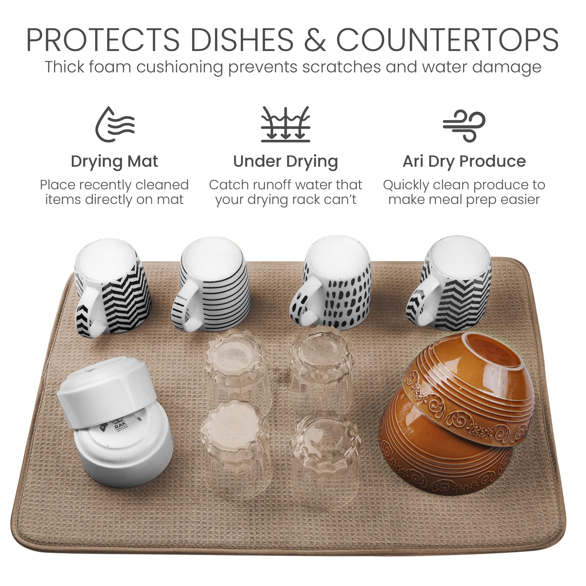 THICKEST , STYLISH MAT | INNOVATIVE HONEYCOMB WEAVE: Keep your counter spotless even while washing a sink full of dishes . Our superbly stylish drying mat is among the thickest on the market today , and its innovative honeycomb microfiber structure enhances absorption and quickens drying time .