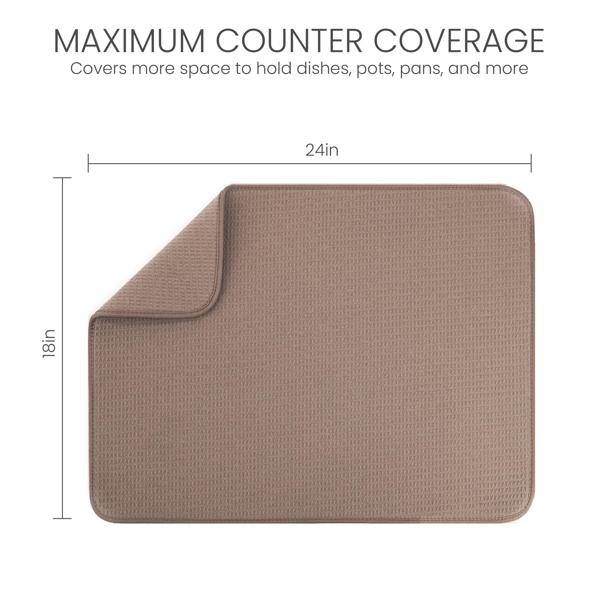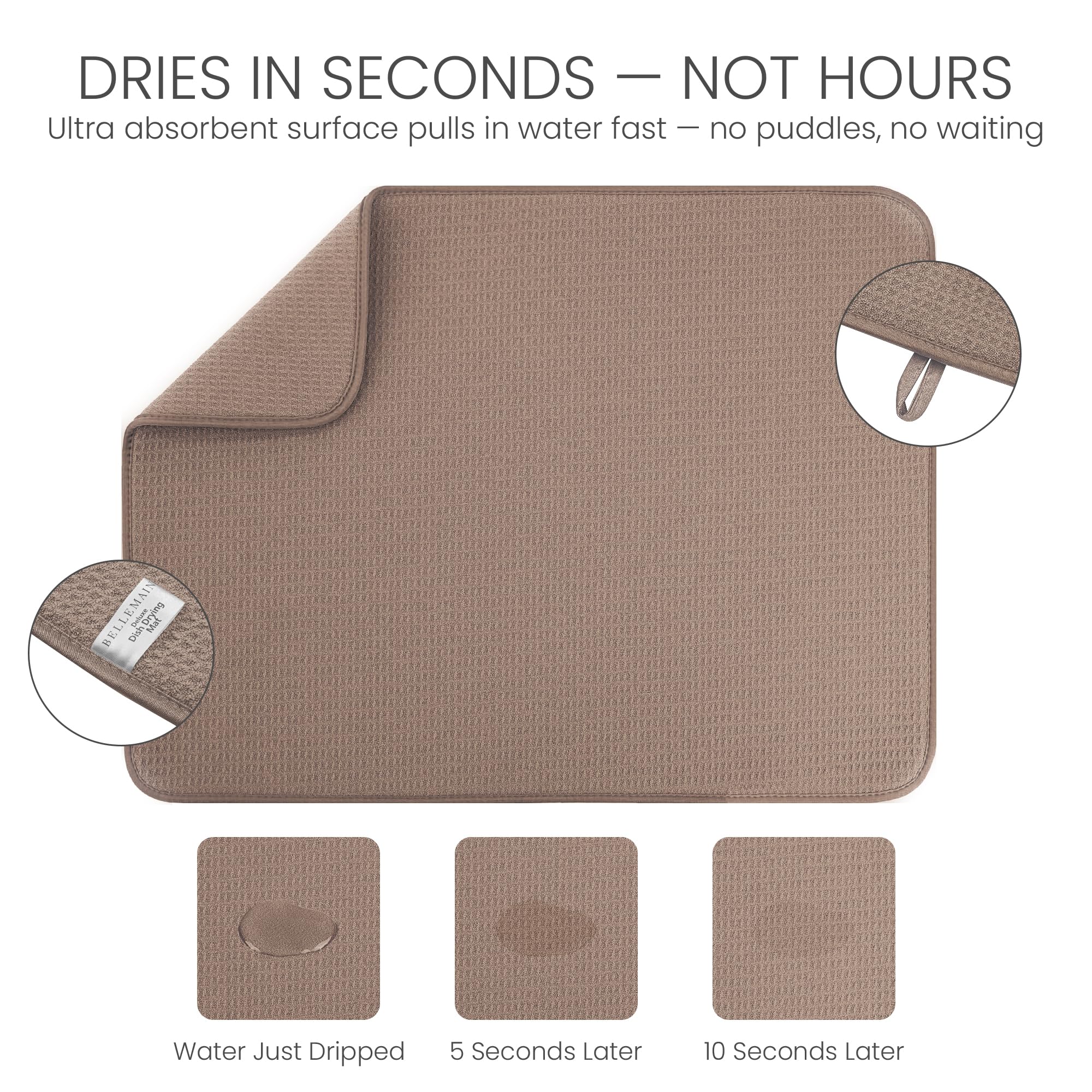EASILY FITS A FULL SINK OF DISHES | STOP USING TWO DISH MATS WHEN ONE WILL DO: Most dish-drying mats are too small to hold your big pots and pans . Bellemain's extra-large absorbent dish mat is designed to take up nearly 40% more space than the typical mat .