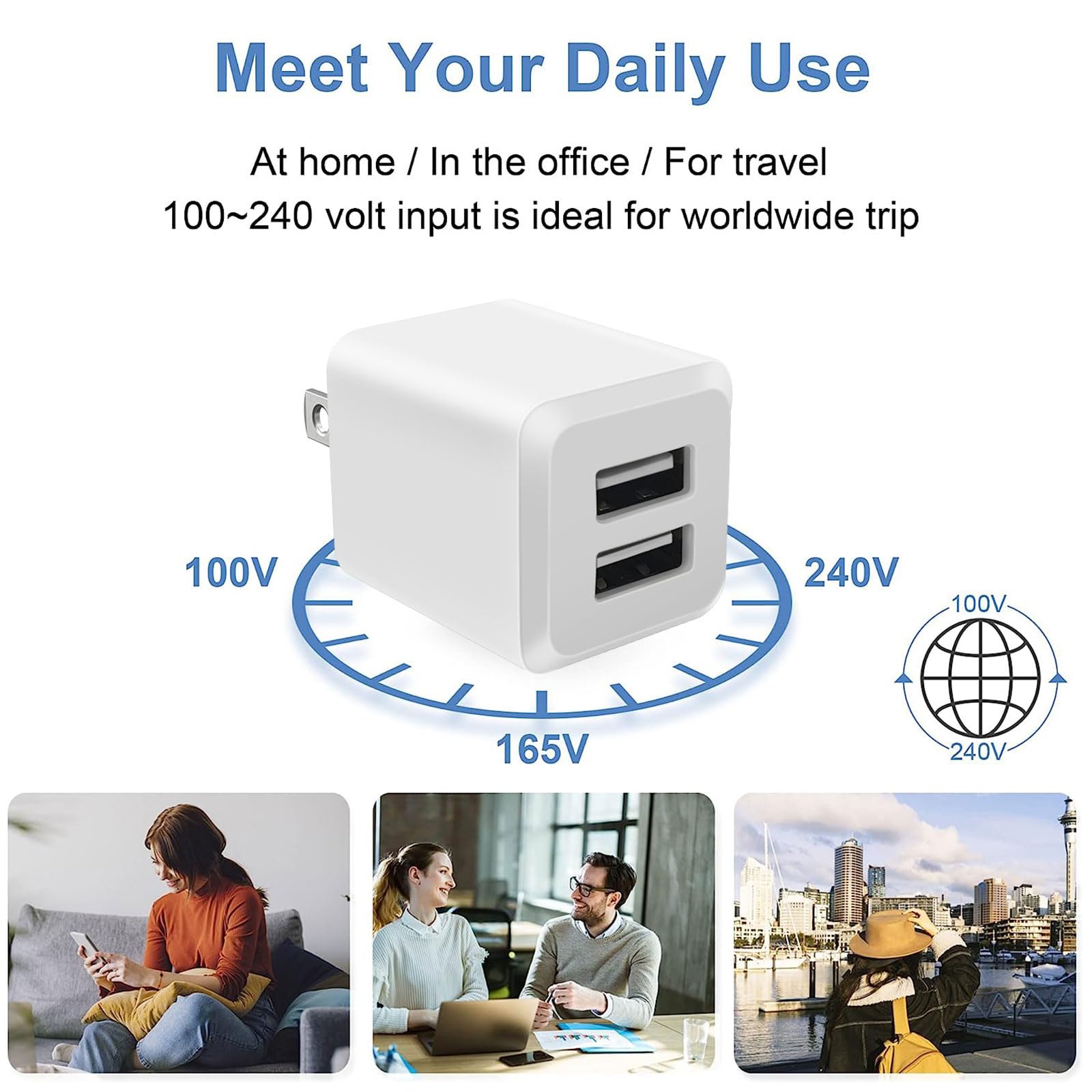 【Specifically Designed】Cell phone charger features a heat-resistant and anti-throw design. The wall charger block is compact, easy to carry, and has a comfortable grip. This usb charger block is suitable for use at home, while traveling, in the office, and on business trips. This charger features a dual port design that provides the most efficient current distribution for your two charging devices. Its USB charger port is manufactured with integrated injection molding technology, making it more robust and reliable.