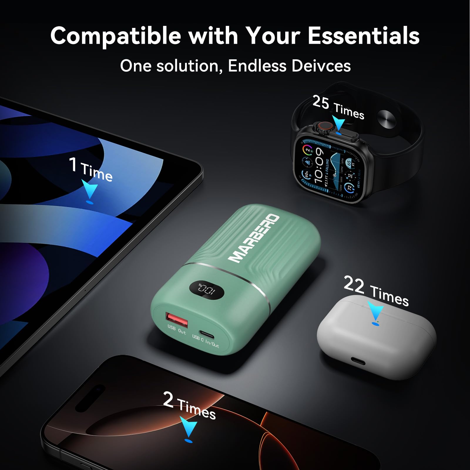 Beyond 95%, Got USB-C INPUT&OUTPUT: While 95% of power banks limit USB-C to input-only, MARBERO's full-featured USB-C port delivers true bidirectional charging—two-way charging, power your devices AND recharge the portable charger with the same USB-C cable.