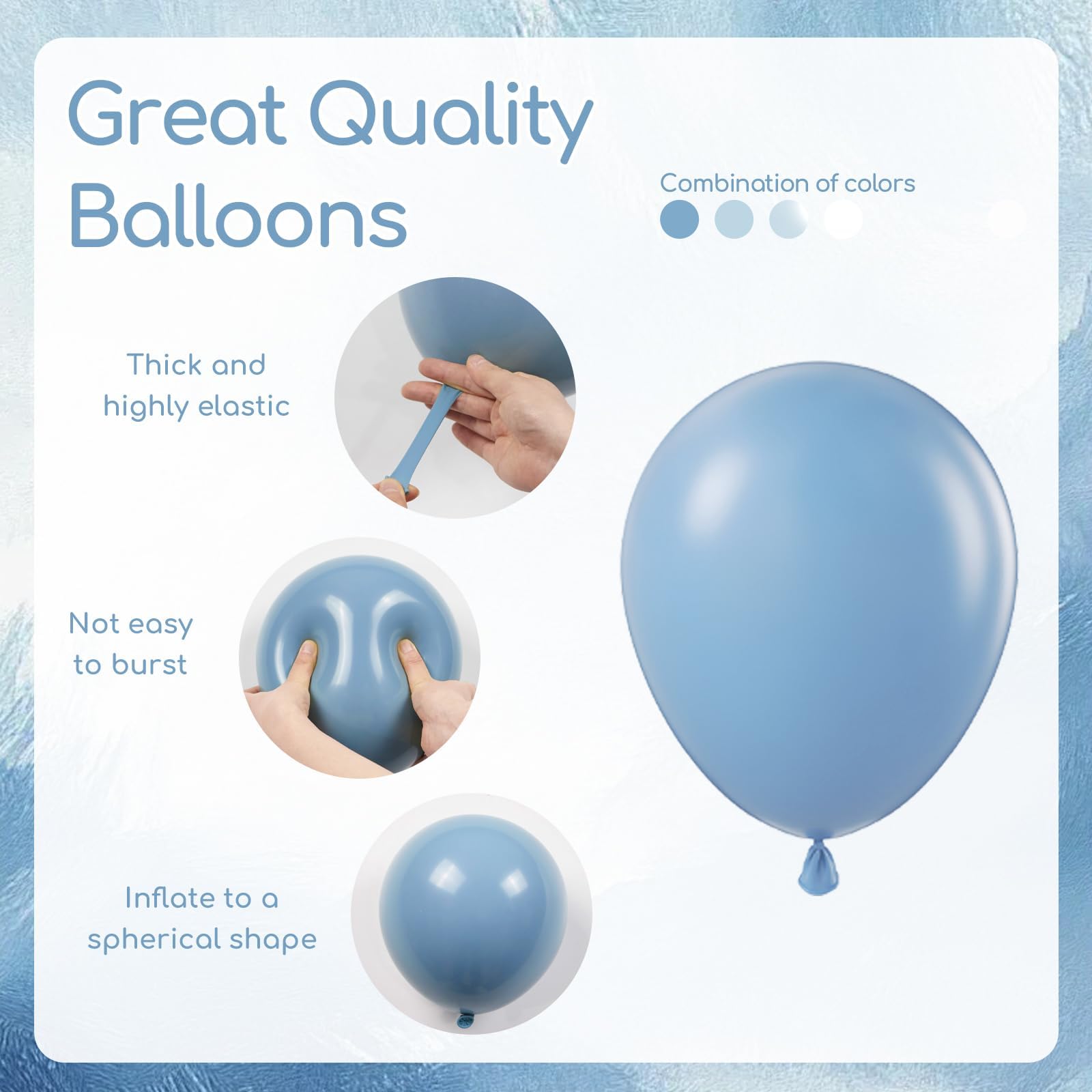 Good Balloons:The pastel blue balloons are made from good quality latex that is easy to inflate, not easy to pop. It is recommended to use a hand pump to inflate quickly, but do not over inflate to maintain good shape
