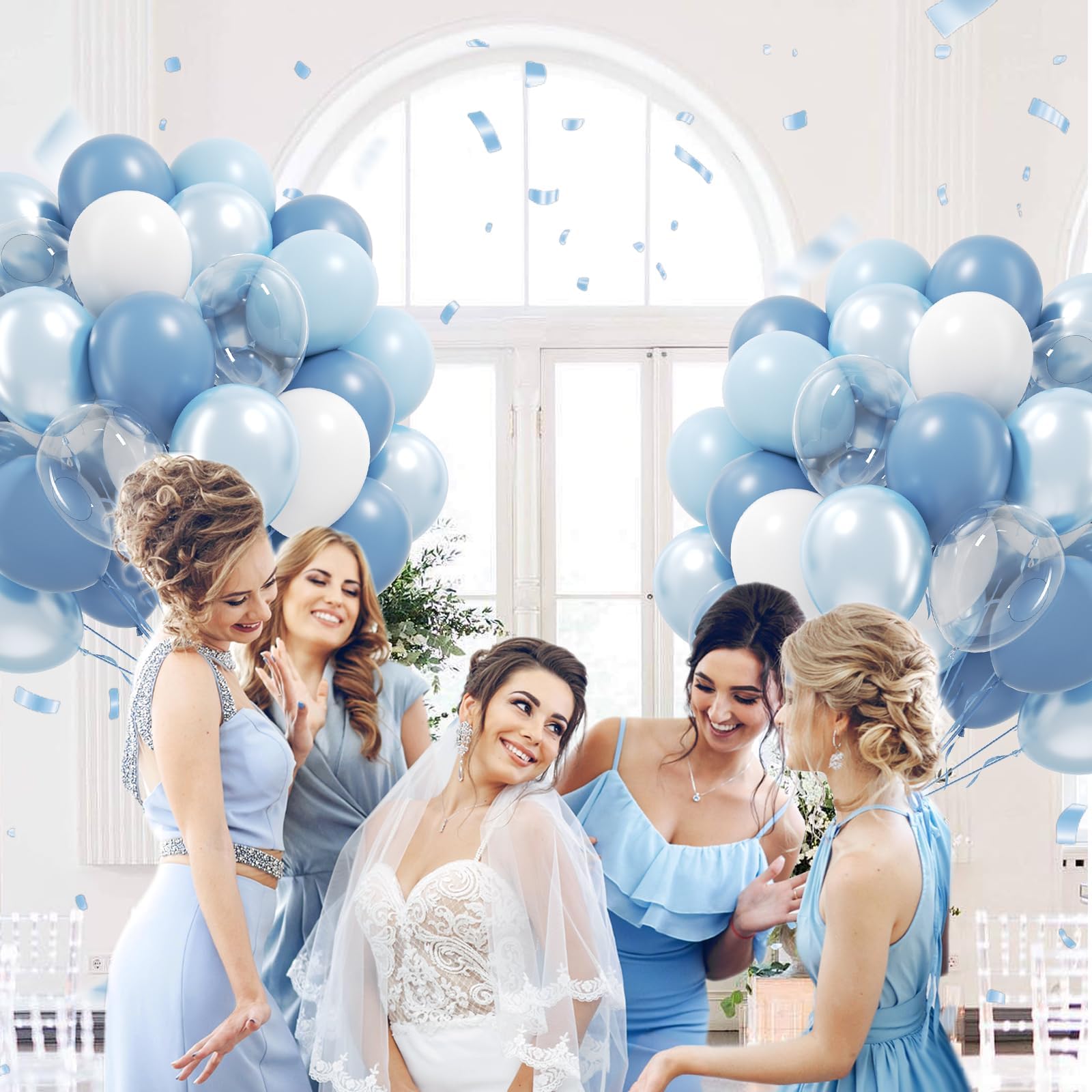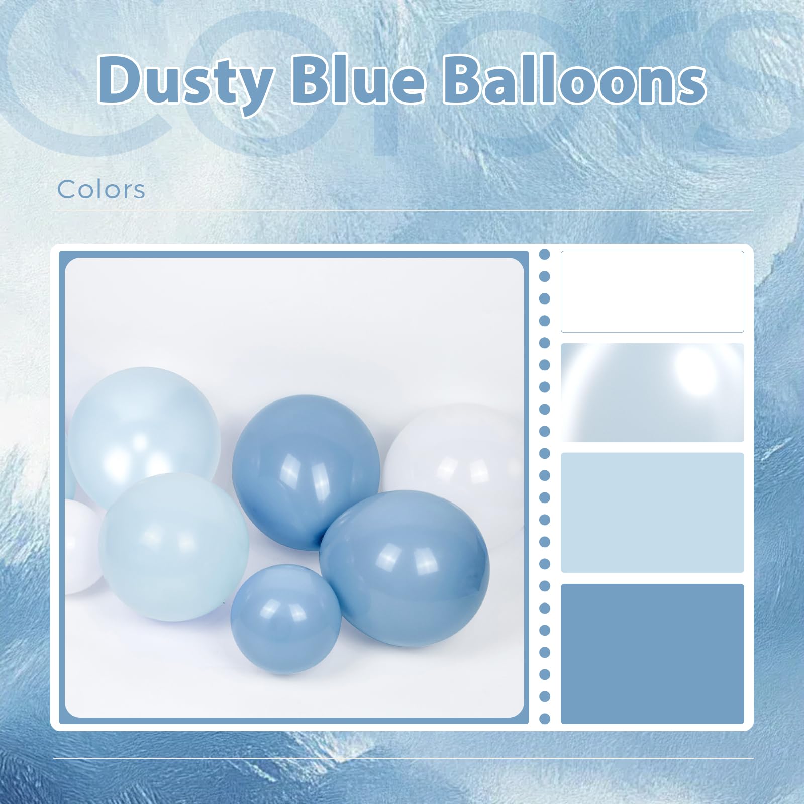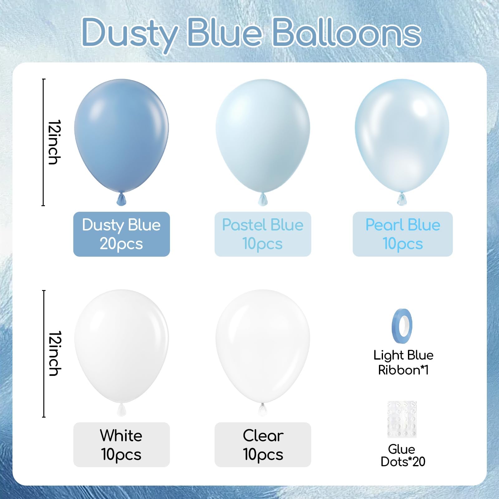 Package Include:The dusty blue and white balloons include 60pcs 12inch dusty blue balloonsx20, 12inch pastel blue balloonsx10, 12inch pearl blue balloonsx10, 12inch white balloonsx10, 12inch clear balloons balloonsx10, light blue ribbonx1, glue dotsx20
