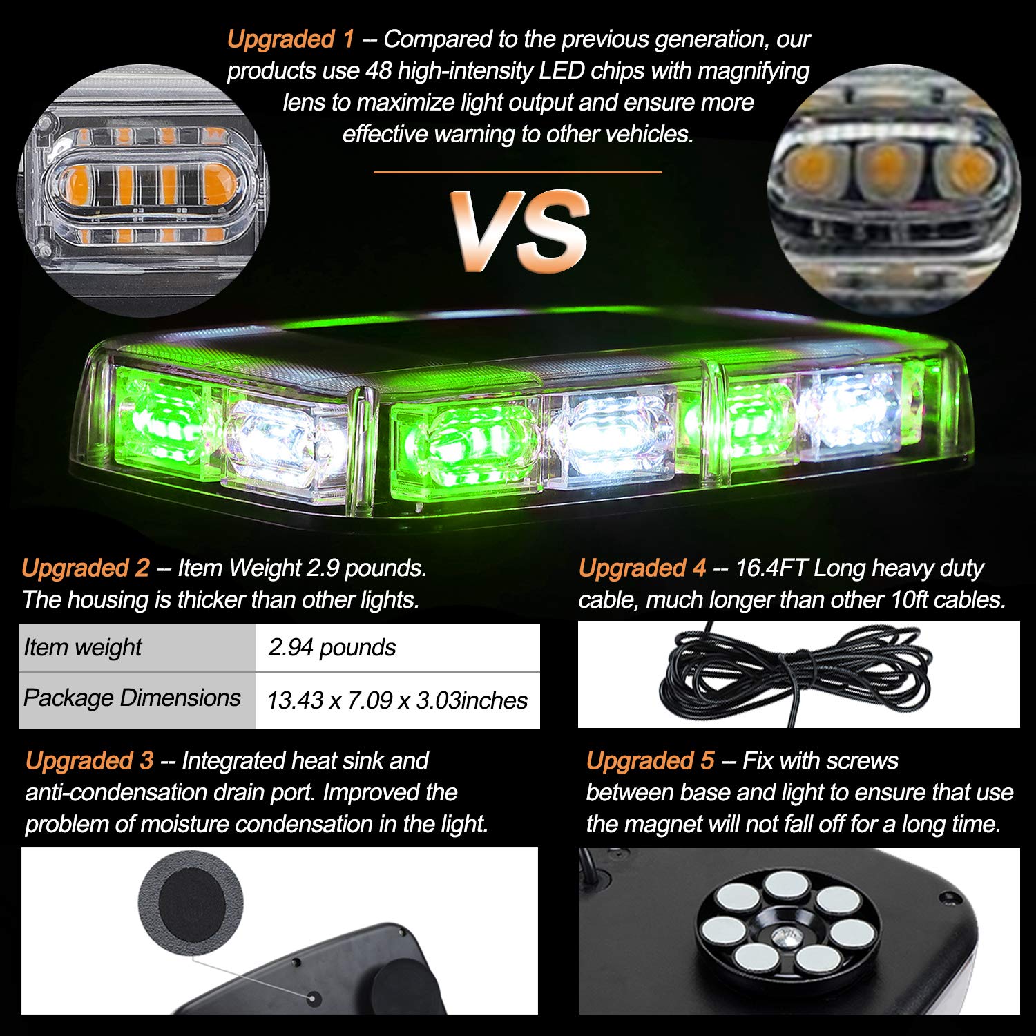UPGRADED -- ASPL Roof top strobe light bar use 48 high-intensity LED chips with magnifying lens to maximize light output and ensure more effective warning to other vehicles. At the same time upgrade the material, waterproof performance, cable length, magnet. Make the light not only bright, but also more durable.