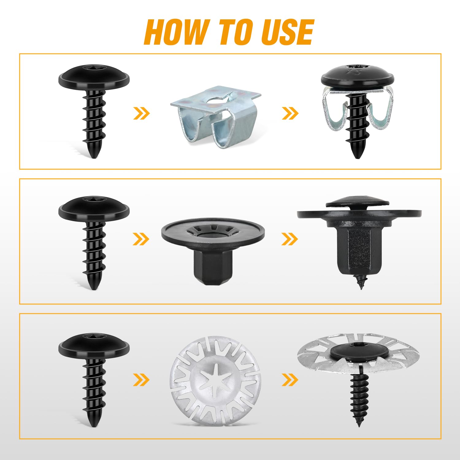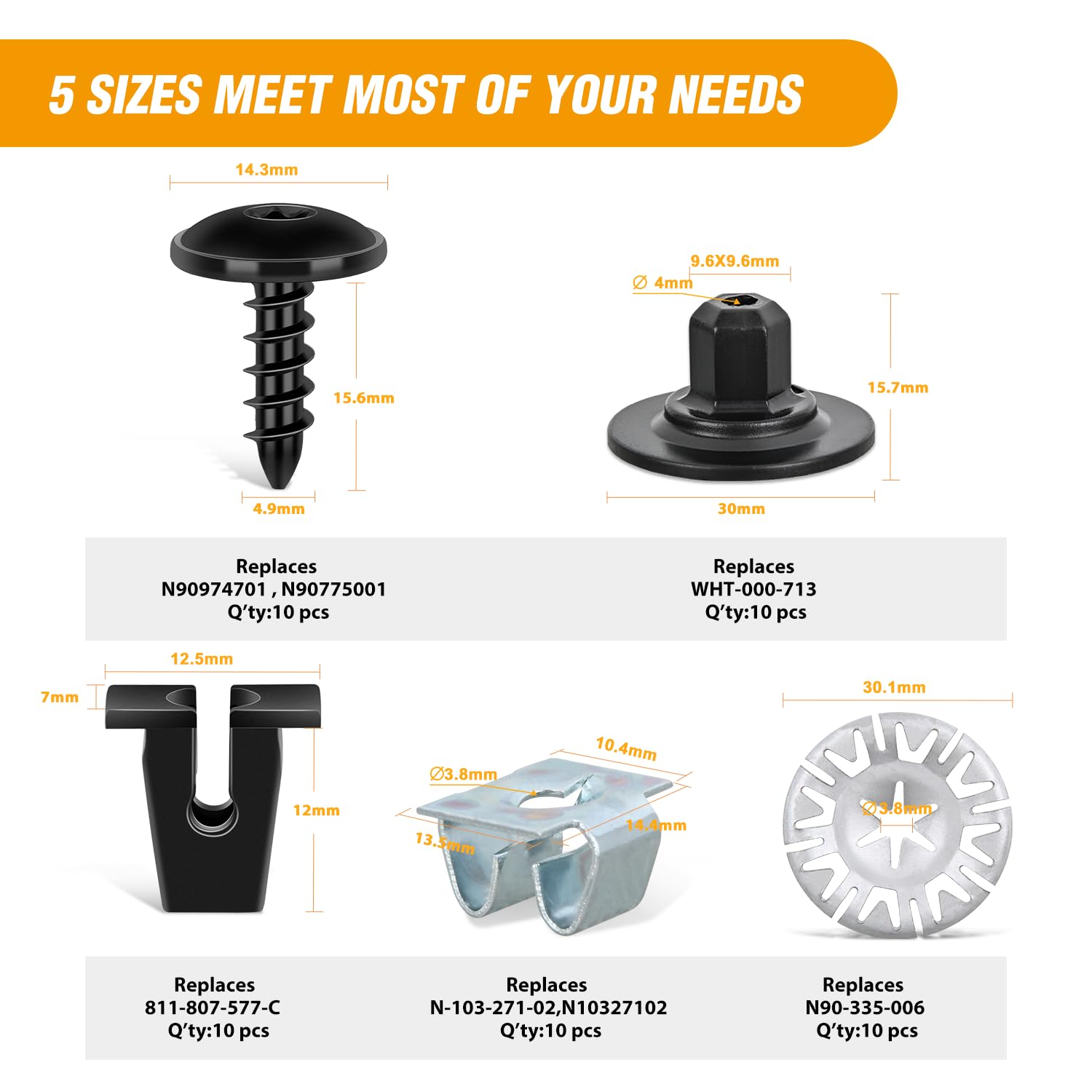 5 Kinds of Types: Contains Screw Grommets, Splash Shield & Wheel Well Push-On Retainers, Under Cover & Fender Liner Nut, Fender Liner & Splash Shield Nut with Screw
