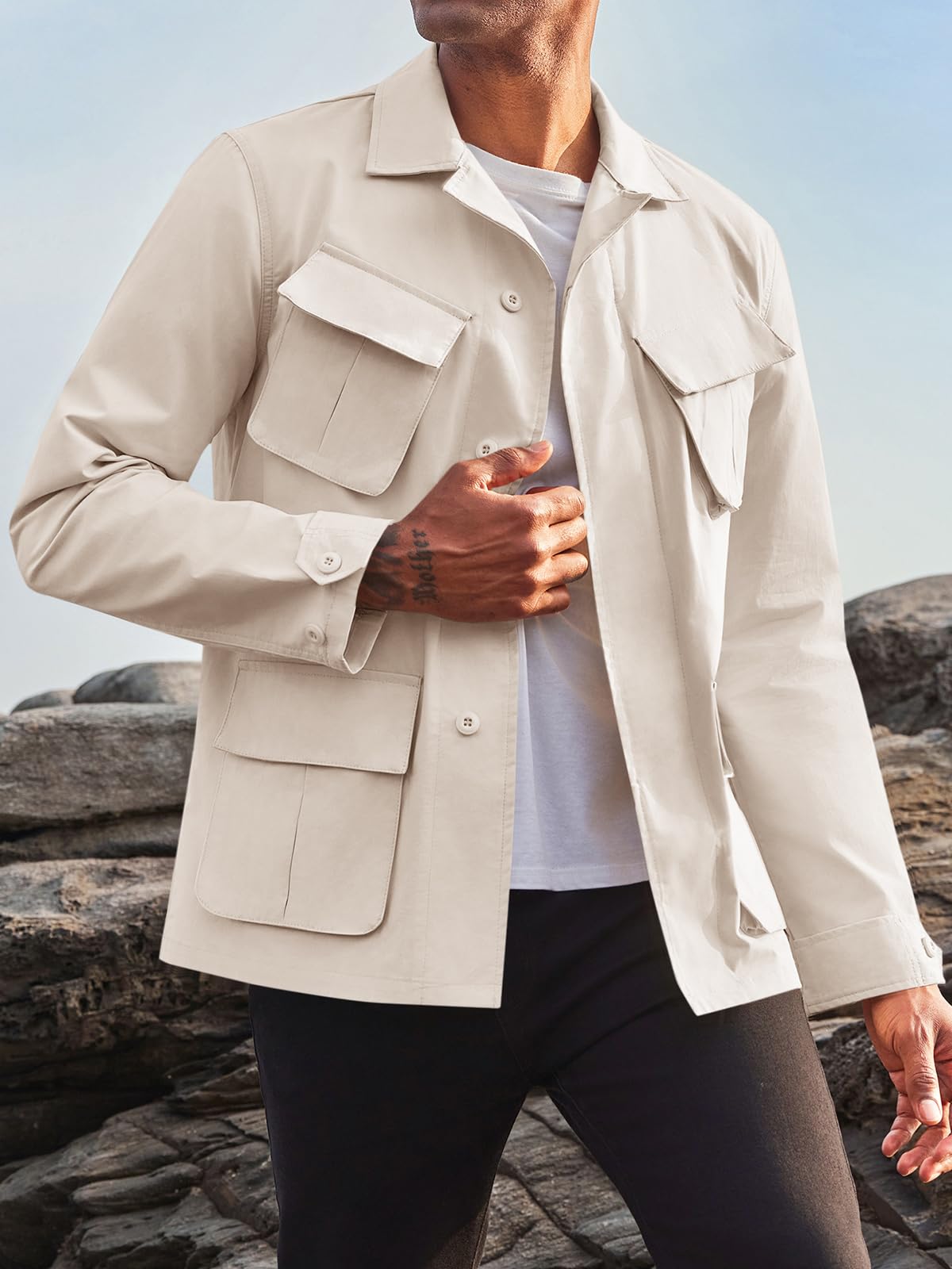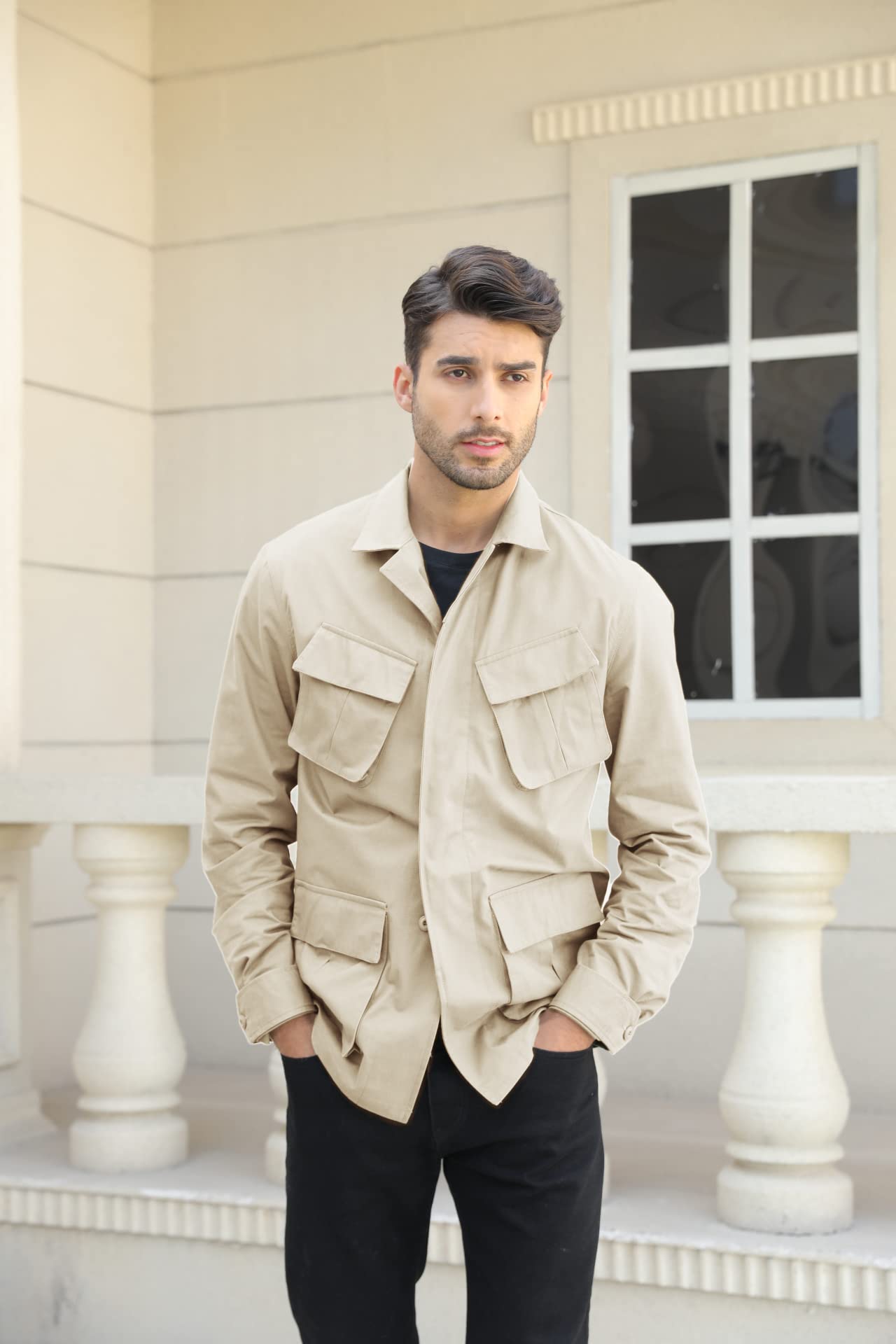 FEATURES:Safari jacket for men, lightweight military windbreaker jacket, pure cotton, solid color, long sleeve, button down, stylish jacket, turn down collar, natural fit, multi pocket. Spring fall winter coats, Casual Jacket, keep fashion and comfortable.
