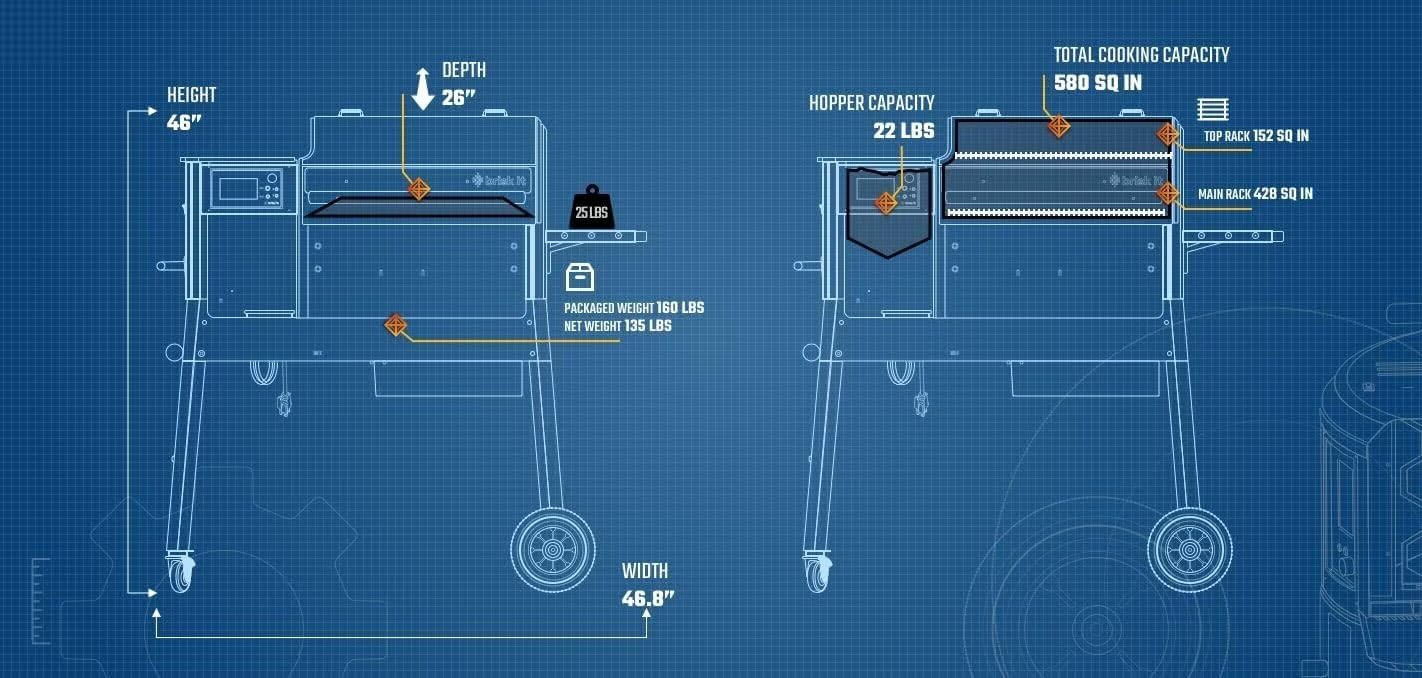 Durable, Spacious Design – Origin-580 Electric Pellet Grill offers 580 sq. in. cooking space—enough for 15 burgers or 2 rib racks. Built tough with weather-resistant steel, rugged wheels, meat probe, and optional cover for year-round outdoor use.