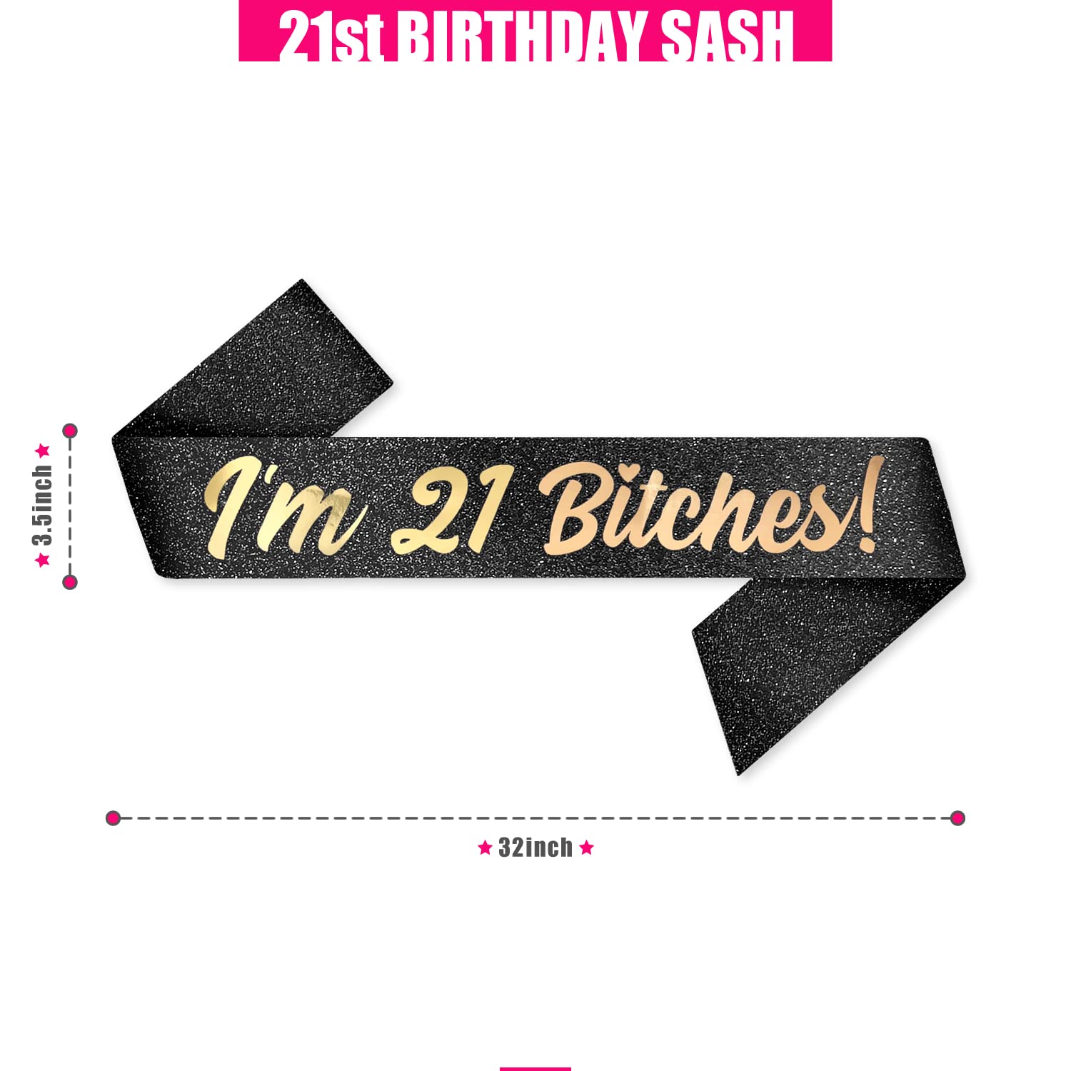 Elegant and Classy I'm 21! Sash for 21st Birthday Decorations : made of high quality sparkling Black Glitter fabric with rose gold compressed foil letters that will compliment any outfit in any color 33.5inch long X 3.5inch wide. Adjustable length for a perfect fit: comes with a gold-colored pin that allows you to adjust the sash to the most comfortable size We strive to provide our customers with only the finest products and most attentive service. So don't delay. Order today!