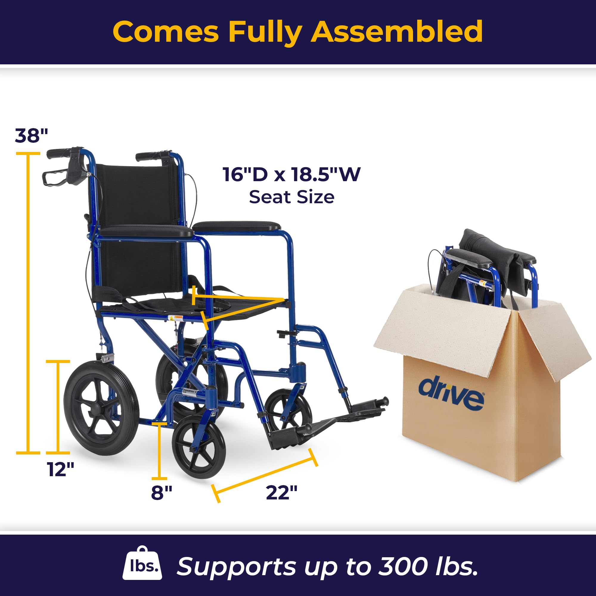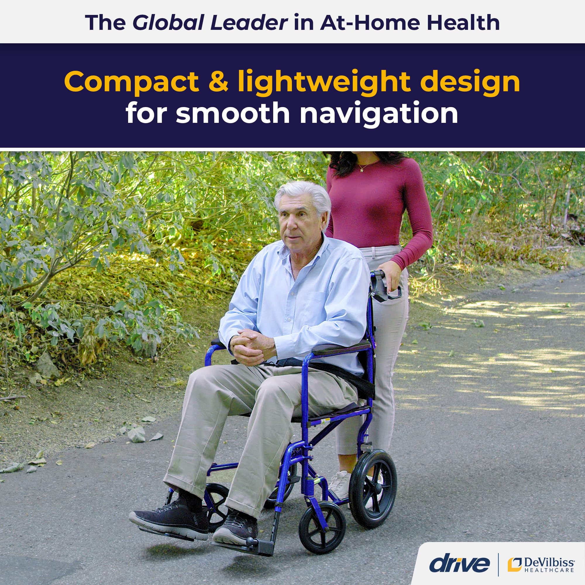 Drive Medical's lightweight transport chair weighs just 19 pounds, yet is expertly designed to ensure safety and support up to 300 pounds. Featuring 12-inch rear tires that can navigate both indoor and outdoor terrain, the aluminum Expedition transport wheelchair is versatile and reliable. It folds like a conventional folding chair and comes standard with fold-down footrests for added convenience and comfort. Companion-activated wheel locks under the handles and seat belt ensure safety, while a simple lever on the chair back allows for quick, flat transport and storage. A great choice for anyone looking for portable lightweight wheelchairs for travel or everyday transport. Backed by a limited lifetime warranty from Drive Medical, a leading brand of mobility aids and other medical goods for more than 20 years, you can purchase with confidence.