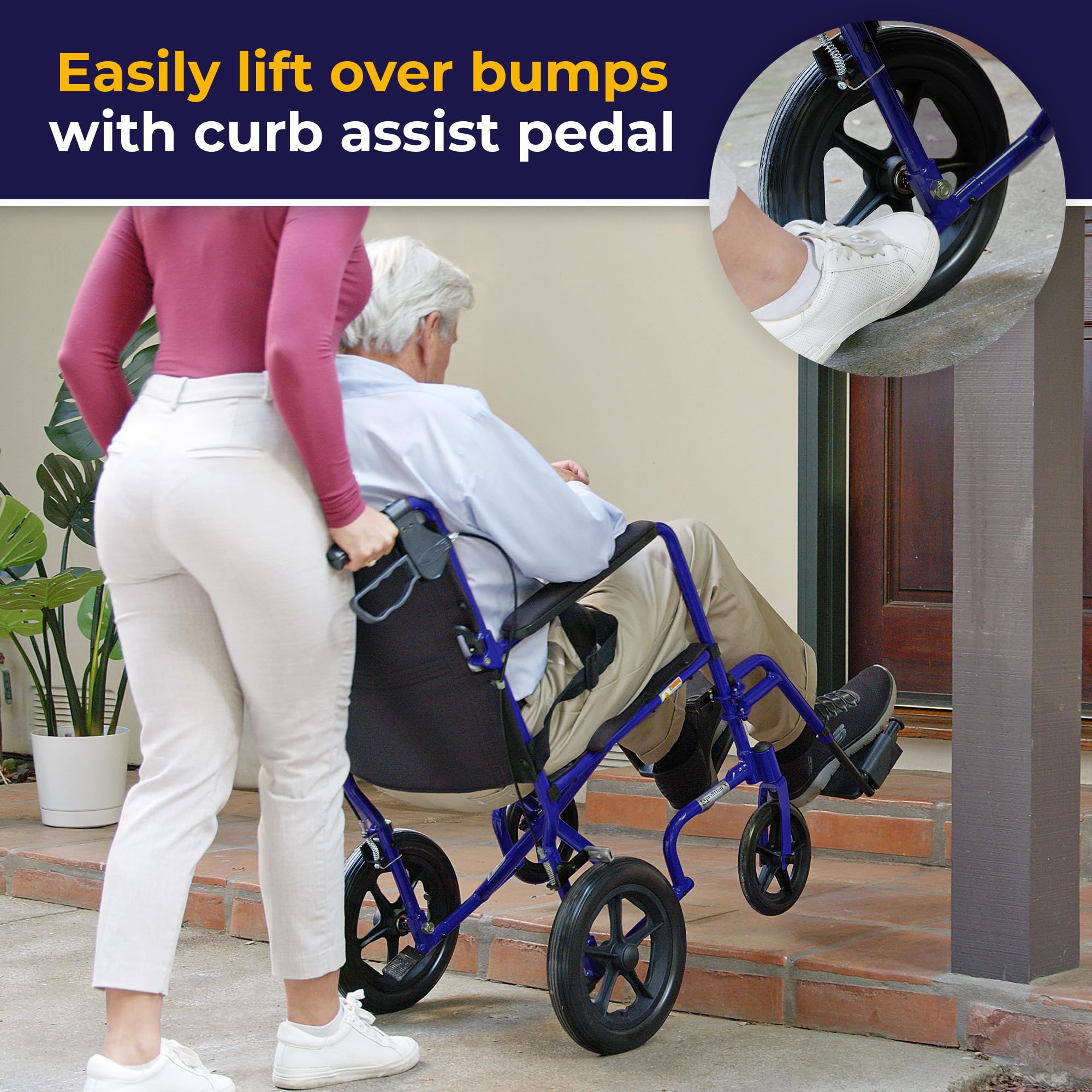 Large Wheels: Rolling wheelchair features solid, 12-inch rear wheels to make pushing a breeze; curb assist next to wheels allows users to gently lift the transport chair's front wheels over bumps