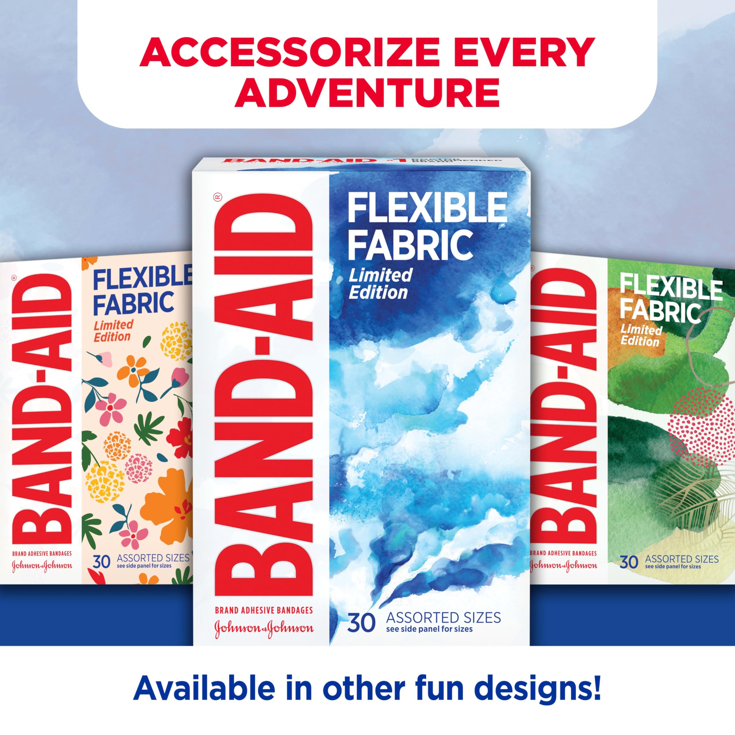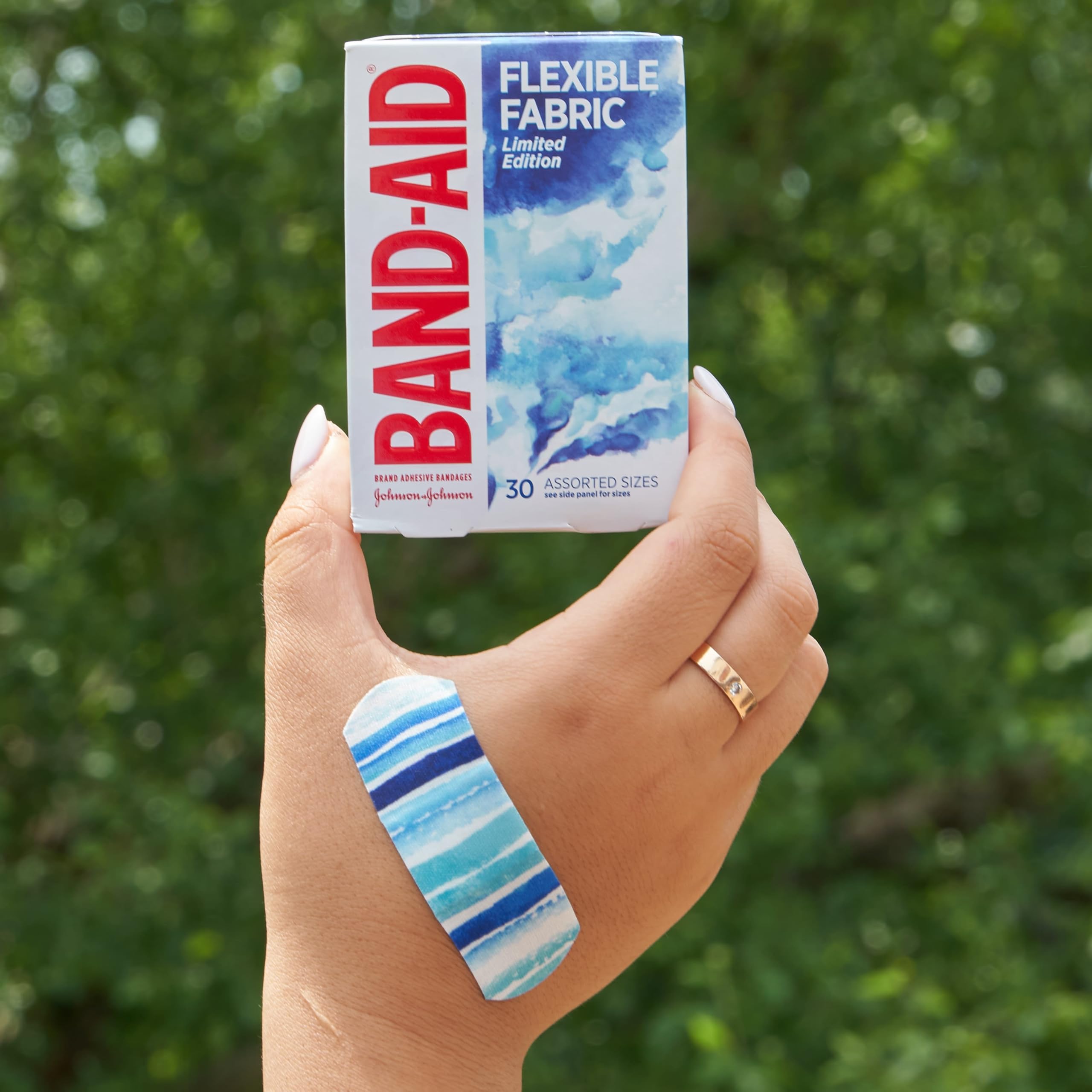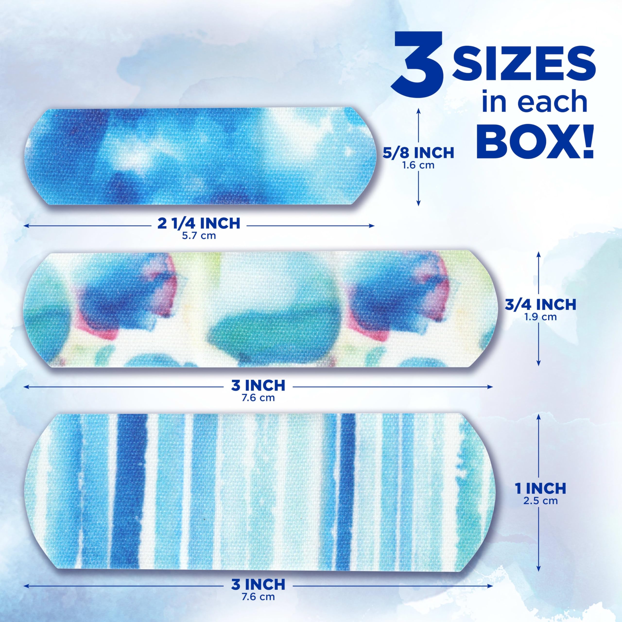 Cover and protect minor cuts, scrapes, burns, and wounds from dirt and germs and express your personal style with designer Band-Aid Brand Flexible Fabric Adhesive Bandages with a decorative Water Color design. Designed to cushion painful wounds while they heal, these colorful flexible fabric bandages from the #1 doctor-recommended brand of adhesive bandages are made with 99.99% germ block material and feature a protective Quilt-Aid comfort pad that won't stick to the wound for gentle removal. These cute elastic bandages are made with flexible material to stretch and move with you and feature colorful, decorative designs. Perfect addition to a first aid kit for adults and kids or at-home wound care supplies, this box contains 30 sterile individually wrapped adhesive bandages in assorted sizes: five 1 by 3 inches; ten 3/4 by 3 inches; and fifteen 5/8 by 2-1/4 inches to help care for all of your minor cuts, scrapes and burns.