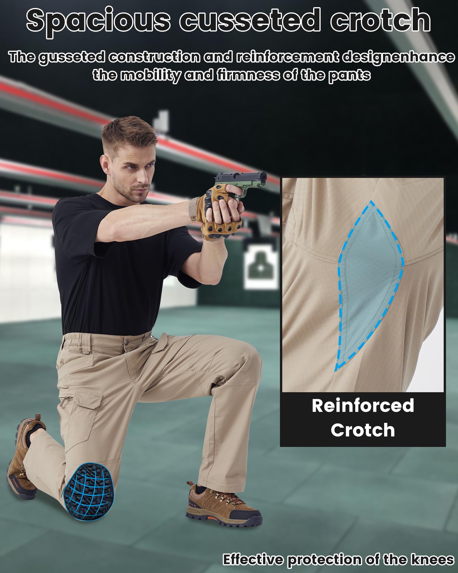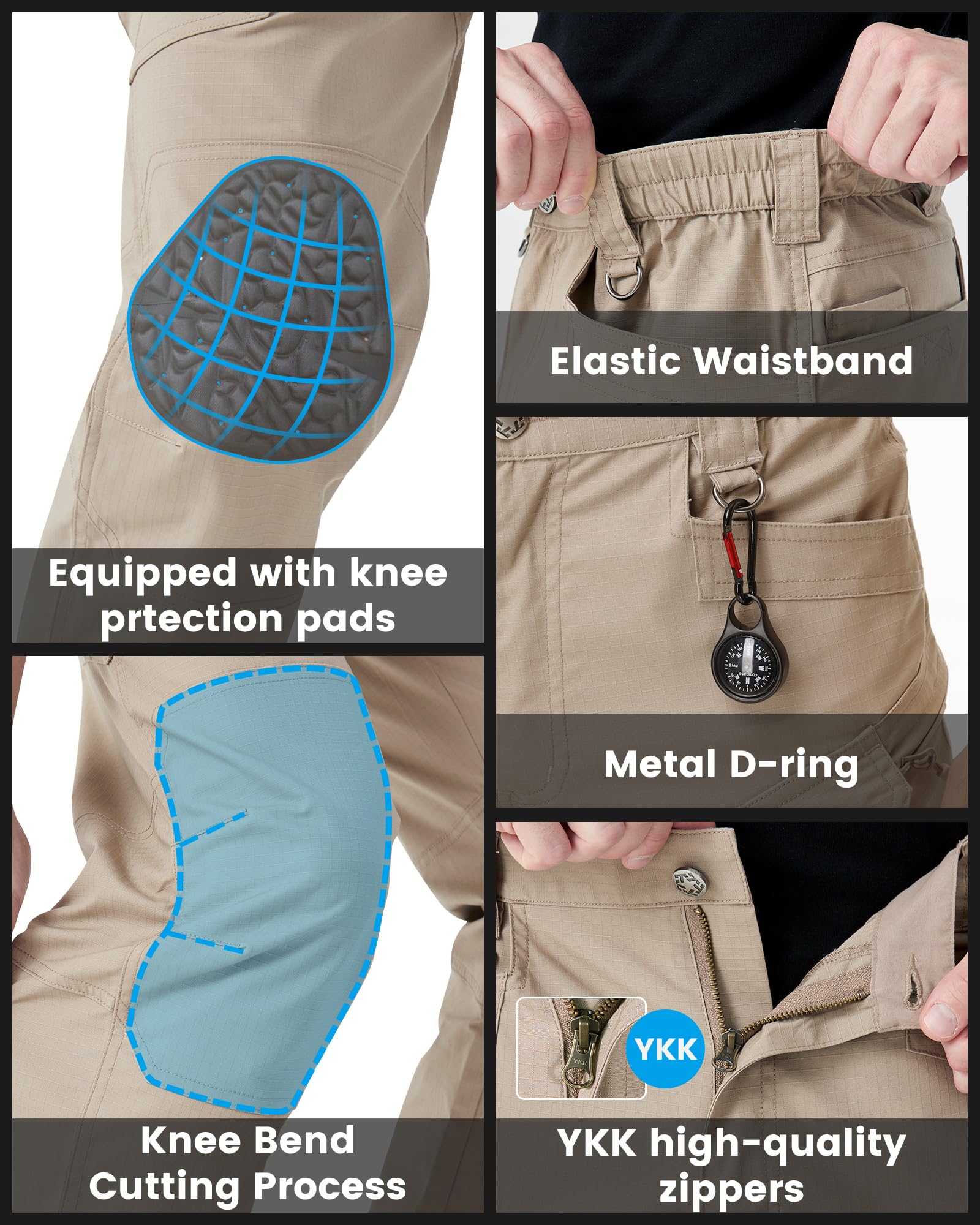 Craftsmanship: YKK metal zipper; widened belt loops; metal D-rings; durable double and triple stitching; elastic waistband; reinforced crotch; ergonomic three-dimensional cutouts at the knees provide greater freedom of movement while eliminating tears, providing greater freedom of movement and reducing leg restriction; knee pads can effectively prevent knee injuries.