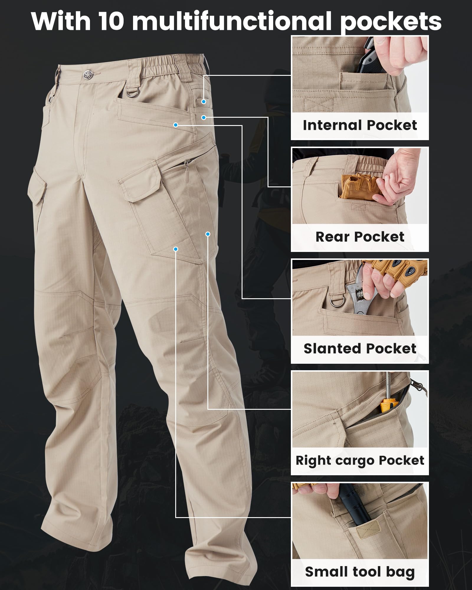 Function: Equipped with 10 multifunctional pockets, two front pockets, two large back pockets installed on both sides of the hips, and equipped with two small inner pockets, two large zipper pockets, and two small flap pockets, it provides ample storage space and effectively prevents items from falling, enough to accommodate all necessary equipment;