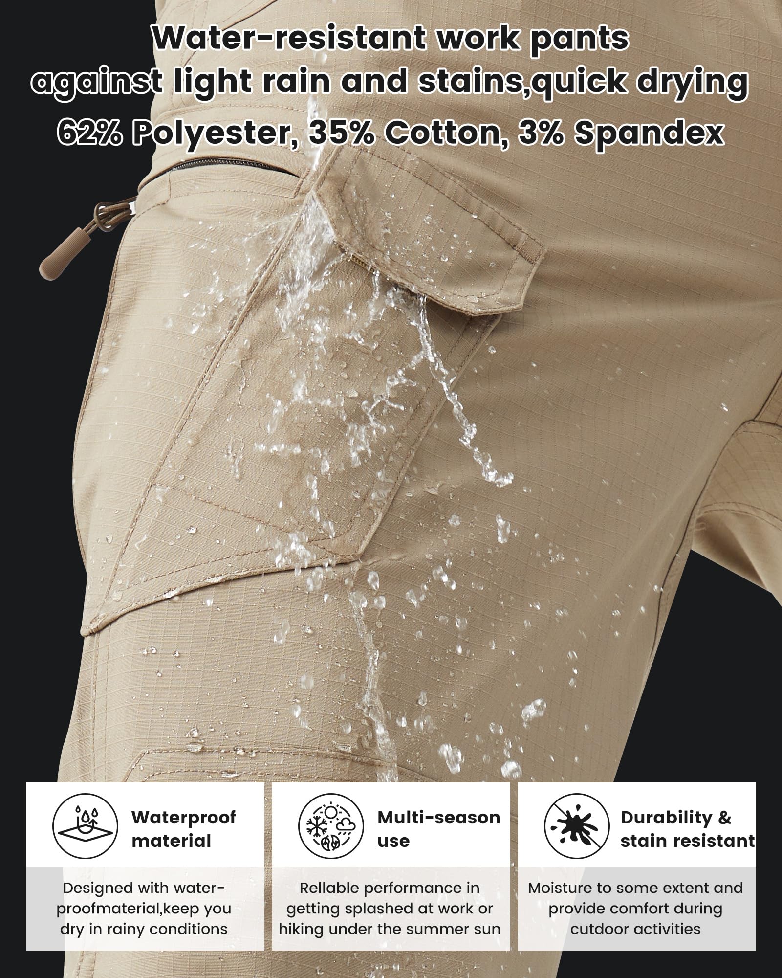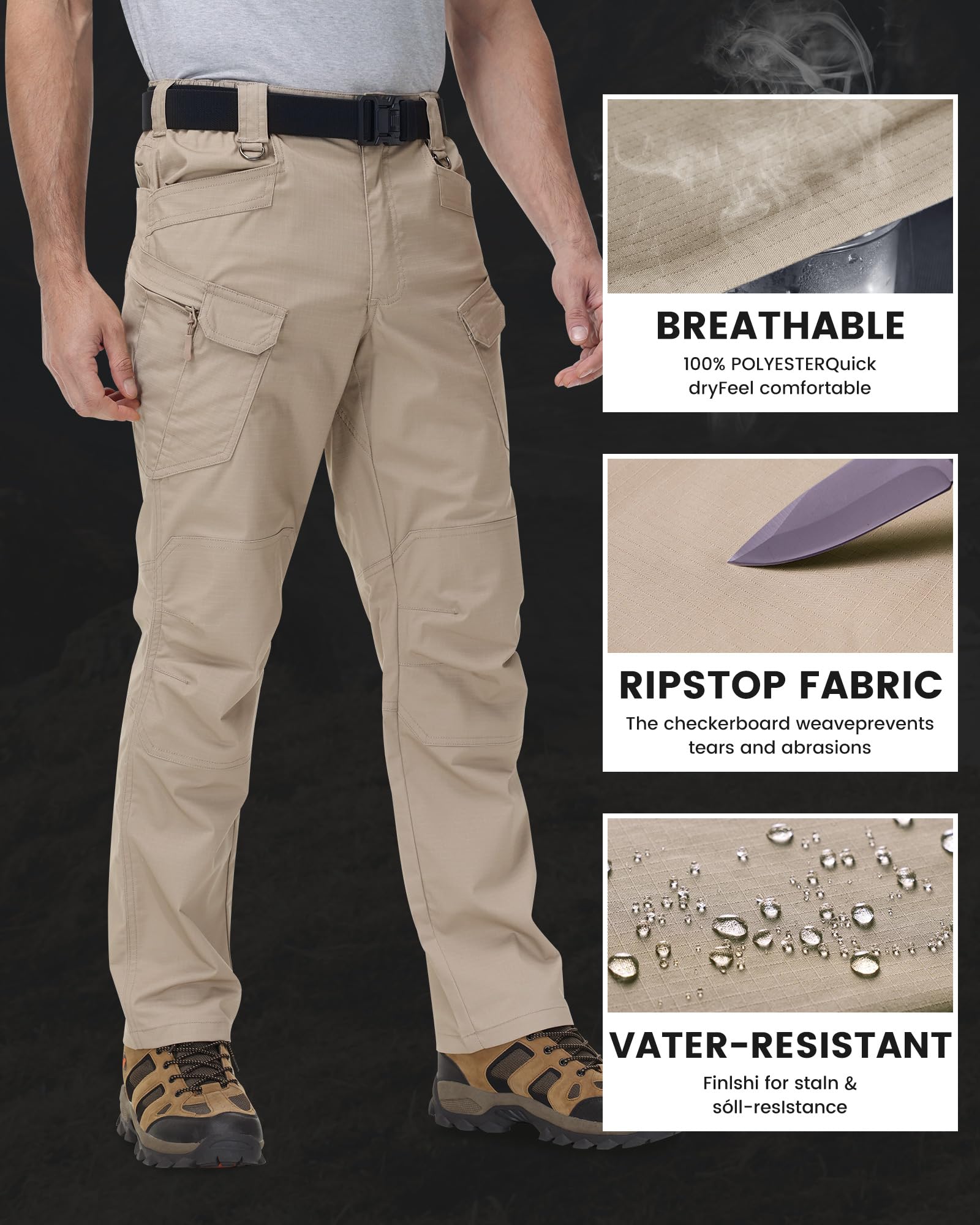 Fabric Features: 62% polyester, 35% cotton, 3% spandex blend. Ripstop fabric offers exceptional resistance to abrasion, water, stains, scratches, and dust. (Note: Exclusive tactical belt not included).