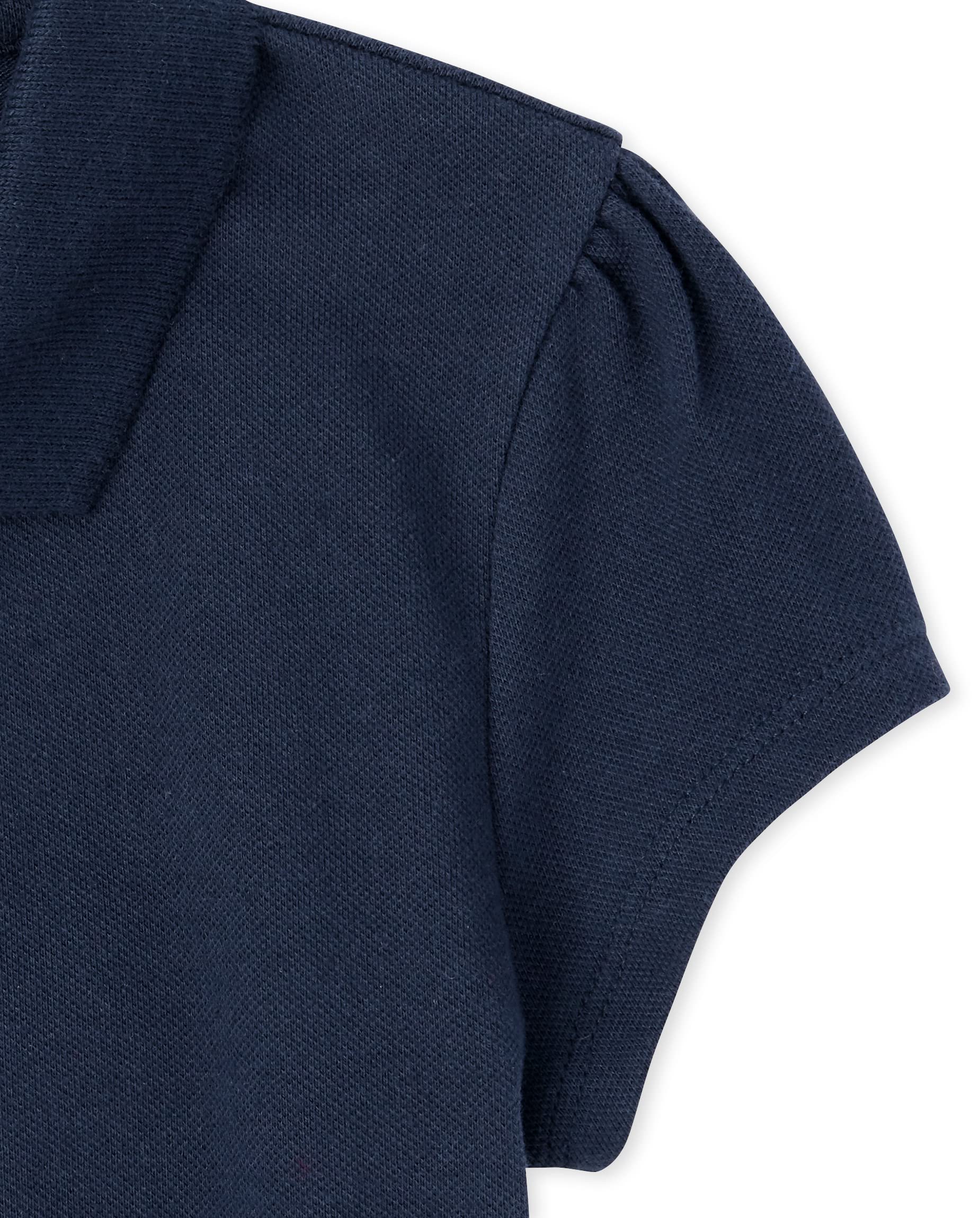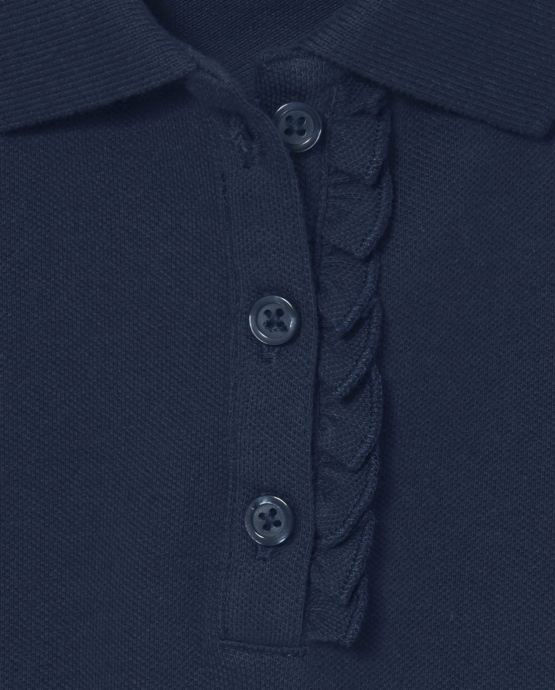 Styled with short sleeves, shirring at the shoulder, ruffle button placket and tagless label