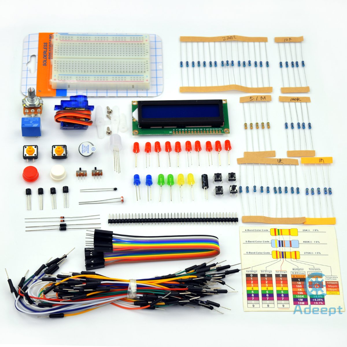 Lessons: About Arduino Lesson 1 Blinking LED Lesson 2 Controlling an LED with a button Lesson 3 Tilt Switch Lesson 4 Active Buzzer Lesson 5 Controlling Relay Lesson 6 LED Flowing Lights Lesson 7 Breathing LED Lesson 8 Controlling a RGB LED by PWM Lesson 9 Serial Port Lesson 10 Controlling Servo motor Lesson 11 LCD1602 display Lesson 12 Using a thermistor to measure the temperature Lesson 13 Photoresistor Package included: 1x LCD 1602 Module 1x Servo Motor 1x Motion Sensor(Tilt Switch) 1x Light Sensor(Photocell) 1x Temperature Sensor 1x Buzzer 1x Relay 2x Switch 2x Button(Large) 1x Button Cap(red) 1x Button Cap(white) 4x Button(small) 1x Potentiometer 1x RGB LED 2x Green LED 10x Red LED 2x Yellow LED 2x Blue LED 2x NPN Transistor 2x PNP Transistor 2x Diode(1N4148) 2x Diode(1N4001) 16x Resistor(220Ω) 10x Resistor(1KΩ) 5x Resistor(10KΩ ) 5x Resistor(100KΩ) 5x Resistor(1MΩ) 5x Resistor(5.1MΩ) 1x Breadboard 1x Hookup Wire Set 10x Male to Female Jumper Wires 1x Header(40pin) 1x Band Resistor Card 1x Project Box