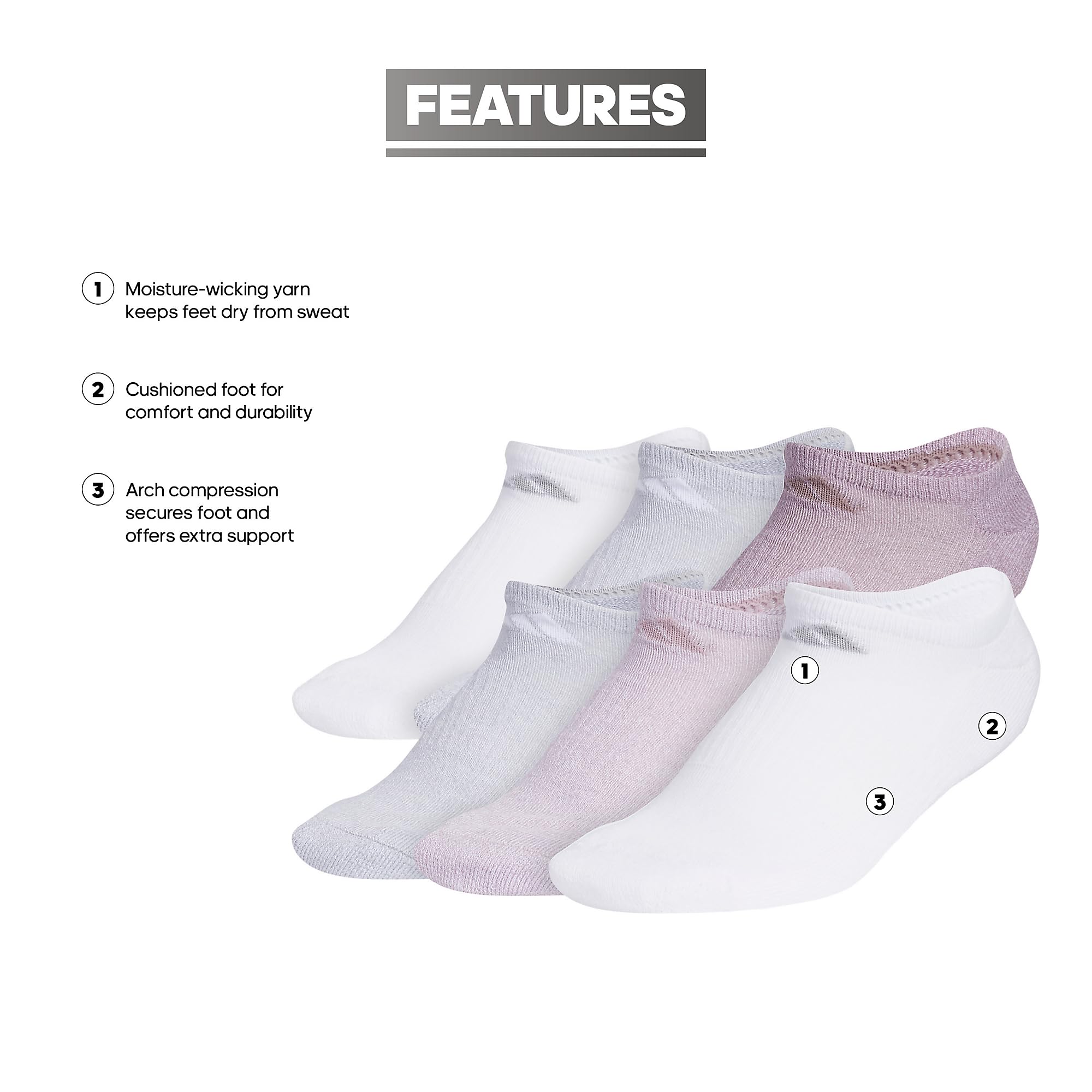 Description Enjoy the blend of quality, comfort, and durability with adidas Women's Athletic Cushioned No Show Socks. These socks feature moisture-wicking yarns to keep feet cool and dry, making them excellent womens athletic socks. Designed with extra cushioning, these cushion socks women provide long-lasting comfort and durability, ideal as stocking stuffers for adults. The arch compression provides a secure fit. With a low-profile look, these no-show socks are great for athletic endeavors or casual wear. Whether you're looking for womens running socks or a thoughtful addition to women stocking stuffers, these athletic socks women are a versatile choice. Grab these running socks and enjoy the mix of style, comfort, and functionality.