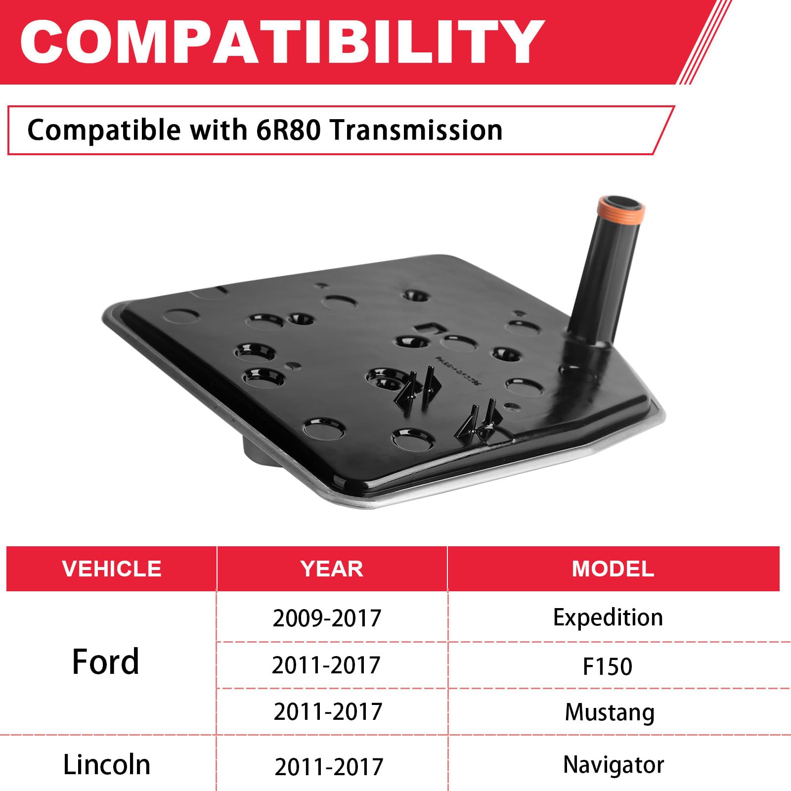 Advantage: Tested & Certified to Meet or Exceed OEM Quality Standards. 100% Tested Before Leaving the Factory. Made of High Quality Material. Replace Part Number: FT-188, BL3Z-7A098-A, BL3Z7A098A Compatible: Fit for 2009-2017 Ford Expedition Fit for 2011-2017 Ford F-150 Fit for 2011-2017 Ford Mustang Fit for 2011-2017 Lincoln Navigator Includes: 1 X Transmission Filter 1 X Gasket Warranty: The Transmission Filter Kit come with 12 Months Warranty. Hassle-Free Return and Refund Policy. Please Buy it with Your Confidence.