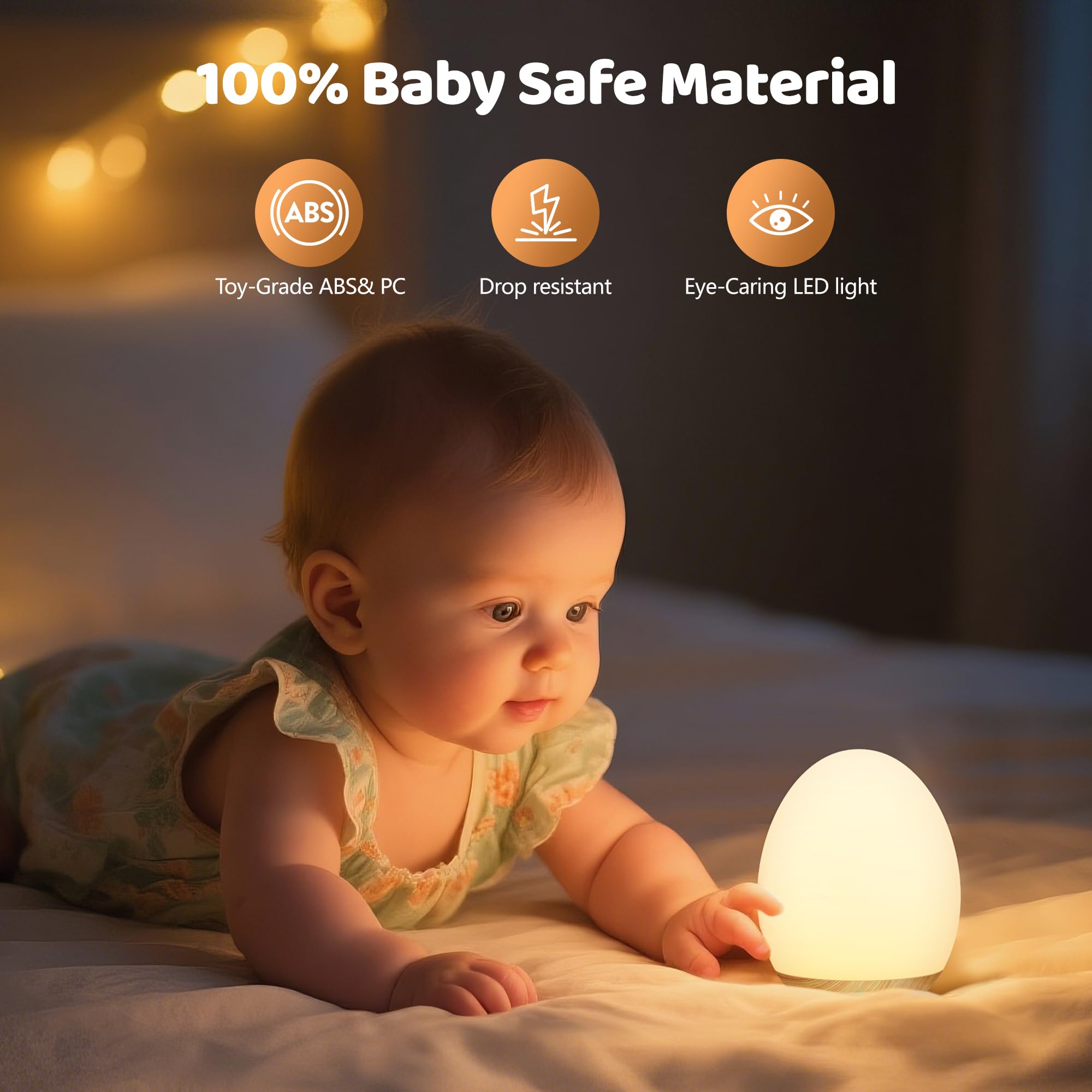Attractive LED Colors: In Color mode, the egg night light will auto-cycle through 8 velvety colors; touch the top for 0.5 seconds to fix your favorite color. Memory function helps you remain the last setting