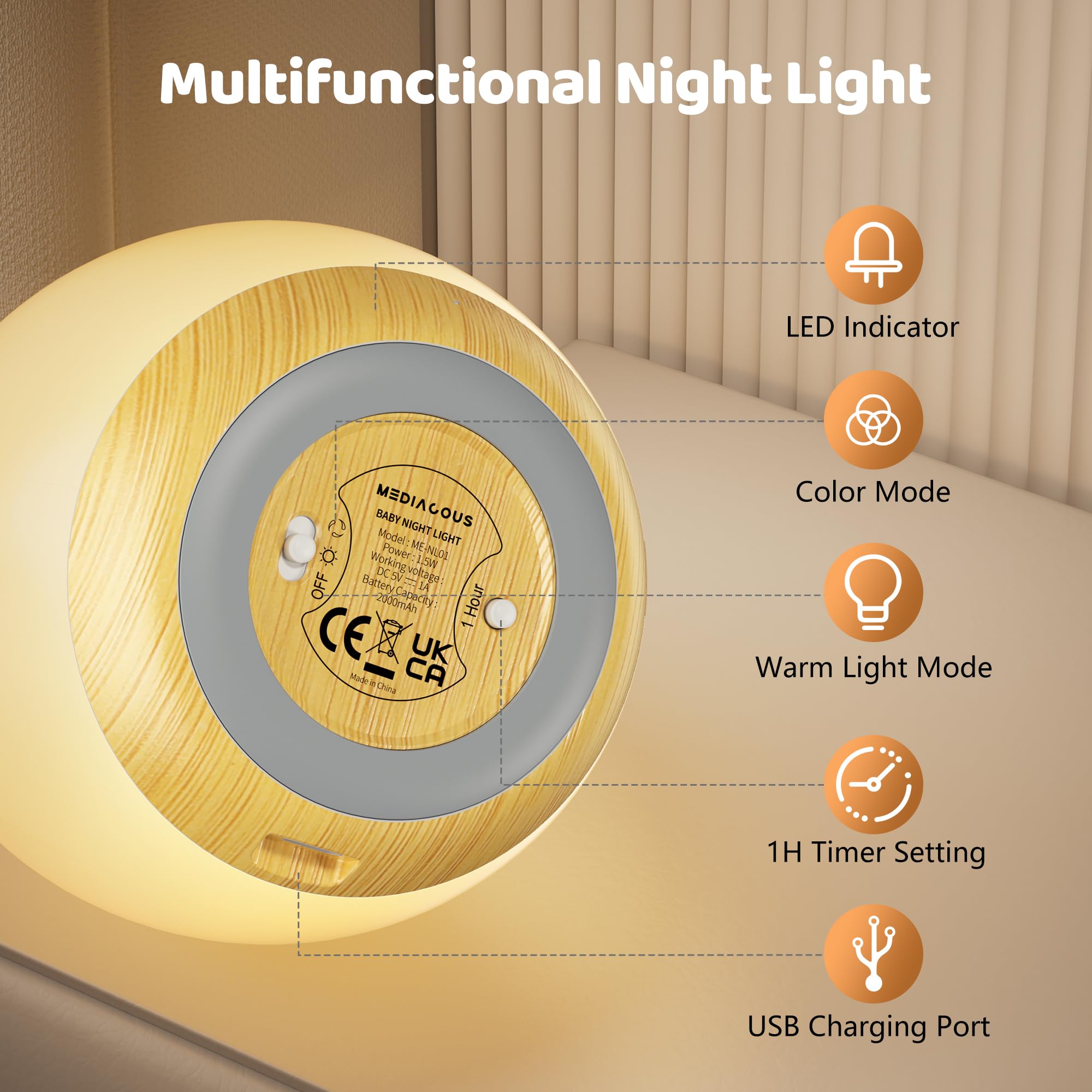 Easy Touch Control: Long press the top for stepless dimming; Tap the top twice to turn on/off the light; hold the top 1.5 s to enter night light mode for late night feeding and diaper changings