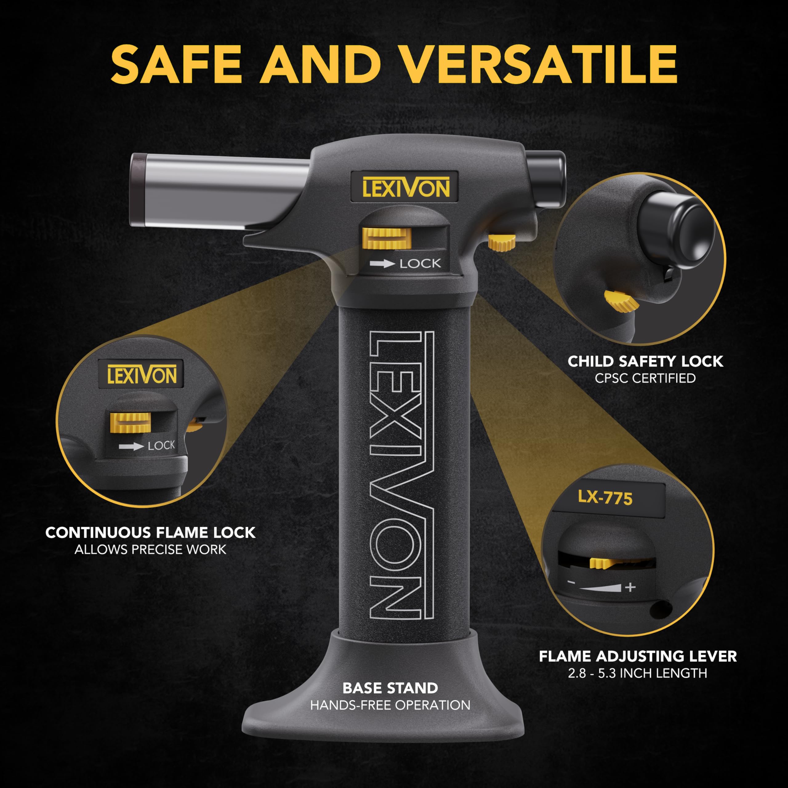 ENHANCED SAFETY MEASURES: Our kitchen torch is built to meet CE safety standards, with a child safety lock and anti-flaring technology for reliable, secure use.