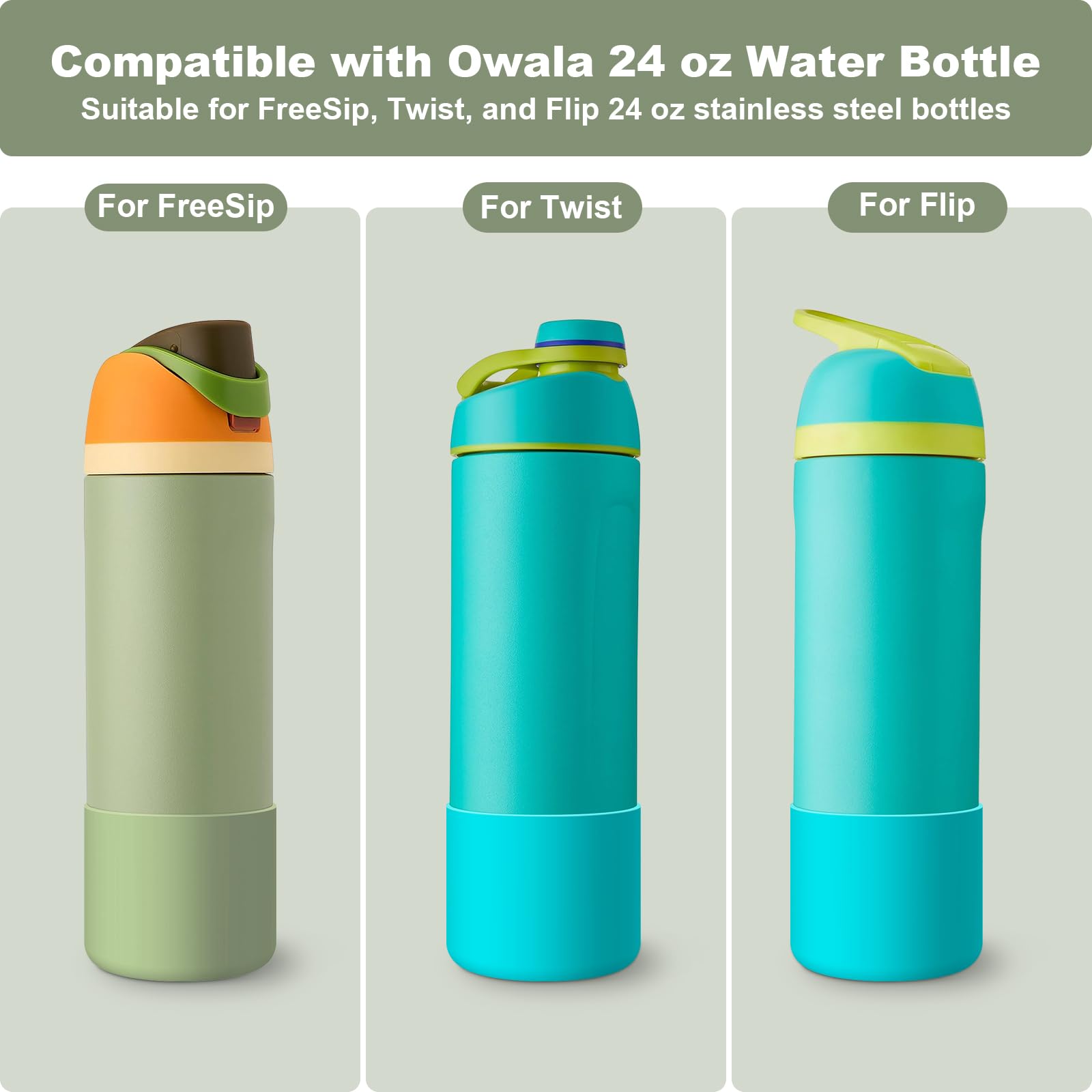 【Perfect Compatiblity】The silicone boot is suitable for Owala 24oz FreeSip, Twist, and Flip stainless steel water bottles. It is precisely made according to the size of the original cups, which perfectly fits the cup bottom and won't fall off easily.